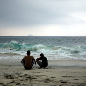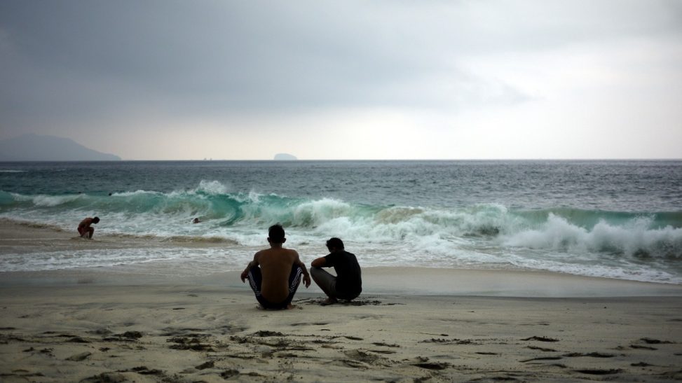 Na obed si v cafe dame rybky a ideme s jedným pivom rovno na pláž. Tam skúšam masáž v daždi, ale je to len taká amatérčina a hlavne ma celkom fajne škrabe pieskový píling. Nemôžem to K s kľudným svedomím odporučať. Dnes zase prší, tak posedávame pod strechou, popíjame kávu, objednáme si gado-gado a keď dojeme vysypeme si prinesené jedlo na ten istý tanier. Treba sa dobre najesť, nech nám nie je zima. K spracováva fotky na notebooku, ja čítam. Dnes je tu partička nemeckých punkerov, ktorí tu tiež chcú prenocovať pod veľkou strechou na pravom kraji pláže. A aj si tam ku koncu začný vyväzovať hamaky medzi bambusové tyče. Chalan s lístkami síce ponúkol 170000R na hlavu za loďku, ale kvôli 10000R dokopy sa mi to s ním nechce riskovať. Hovorím mu, nech ponúkne niečo vážnejšieho, ale nakoniec odchytí turistu a natĺka ho väčší biznis, tak máme pokoj.