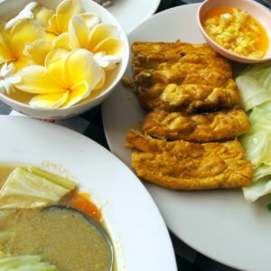 Zastavíme sa v prvom podniku na pláži, že si dáme kávu a prípadne niečo na jedenie. Účtujú tu ale 10% daň, a káva je drahá a stojí za prd, tak sa radšej presúvame inam. Obzeráme podniky, jeden má aj menu po Česky a vnútri sú obe „naše“ zástavy. Tu majú ale ešte vyššiu daň a nejako sa na to necítime. Snažíme sa takým podnikom, čo účtujú daň extra vyhýbať, lebo to berieme ako pokus ozavádzanie zákaznika, keď v menu uvádzajú brutto ceny. Ani v USA sa nám to nepáči. Nakoniec s malou pomocou buzolky objavíme sympaticky vyzerajúce #3 – Padangbai cafe. V rodinnom útulnom podniku s výhľadom na more si pochutnáme na výbornom filete z barakudy a dobrom i keď na môj vkus suchšom a príliš jemnom – priam až bez chuti – steaku z marlina. Mäsko je výborne ugrilované, vôbec nie presušené a chutí čerstvo. Obe ryby sú po 40000R. Sme veľmi spokojní a je to kúsok od nášho bývania.