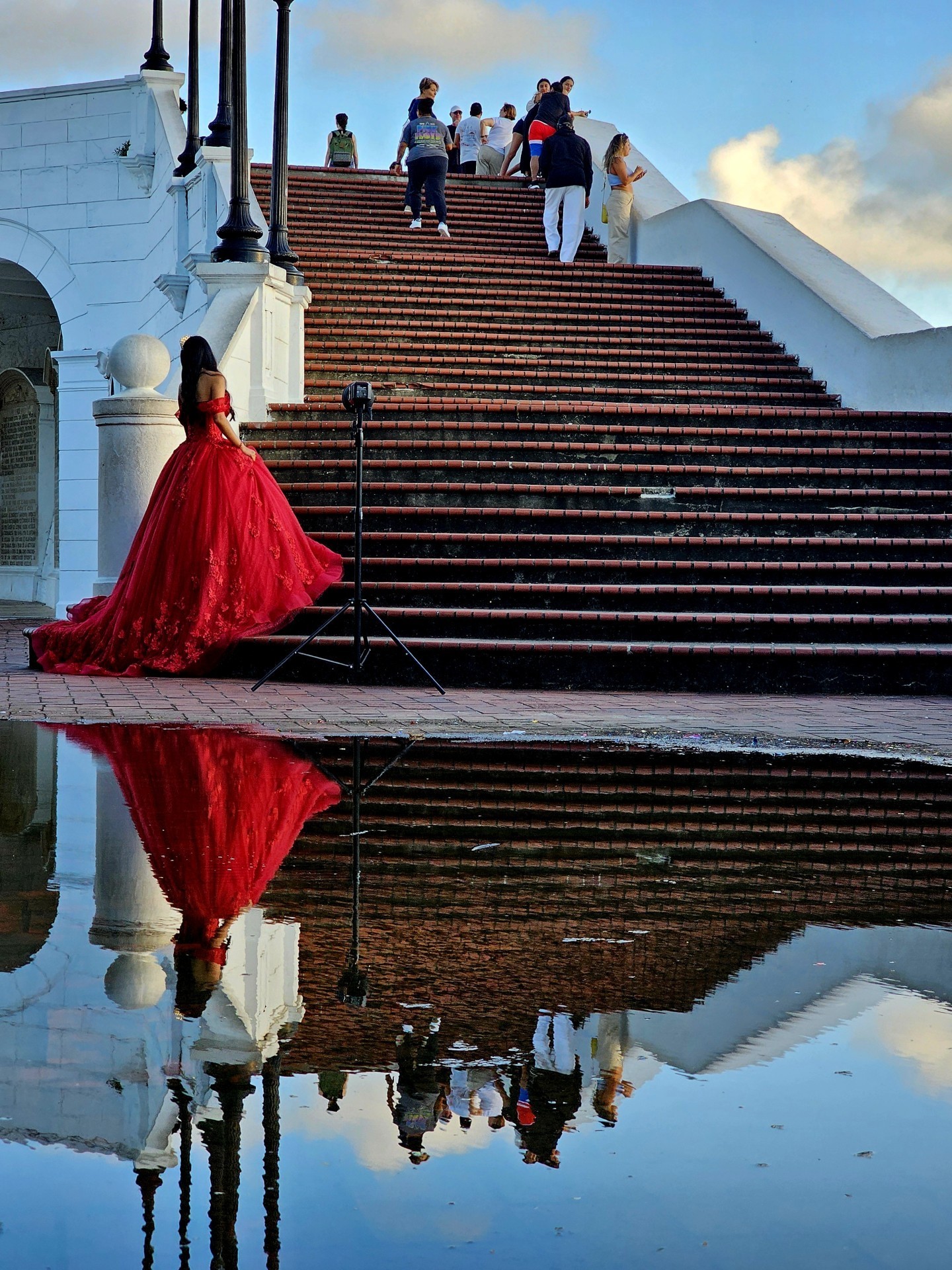 Na podvečernej prechádzke máme krásne svetlo, snažíme sa kôli posunu byť čo najviac na slnku. Na schodoch okolo panamského pomníka sa fotia 15ky. Tak si ich fotíme aj my.