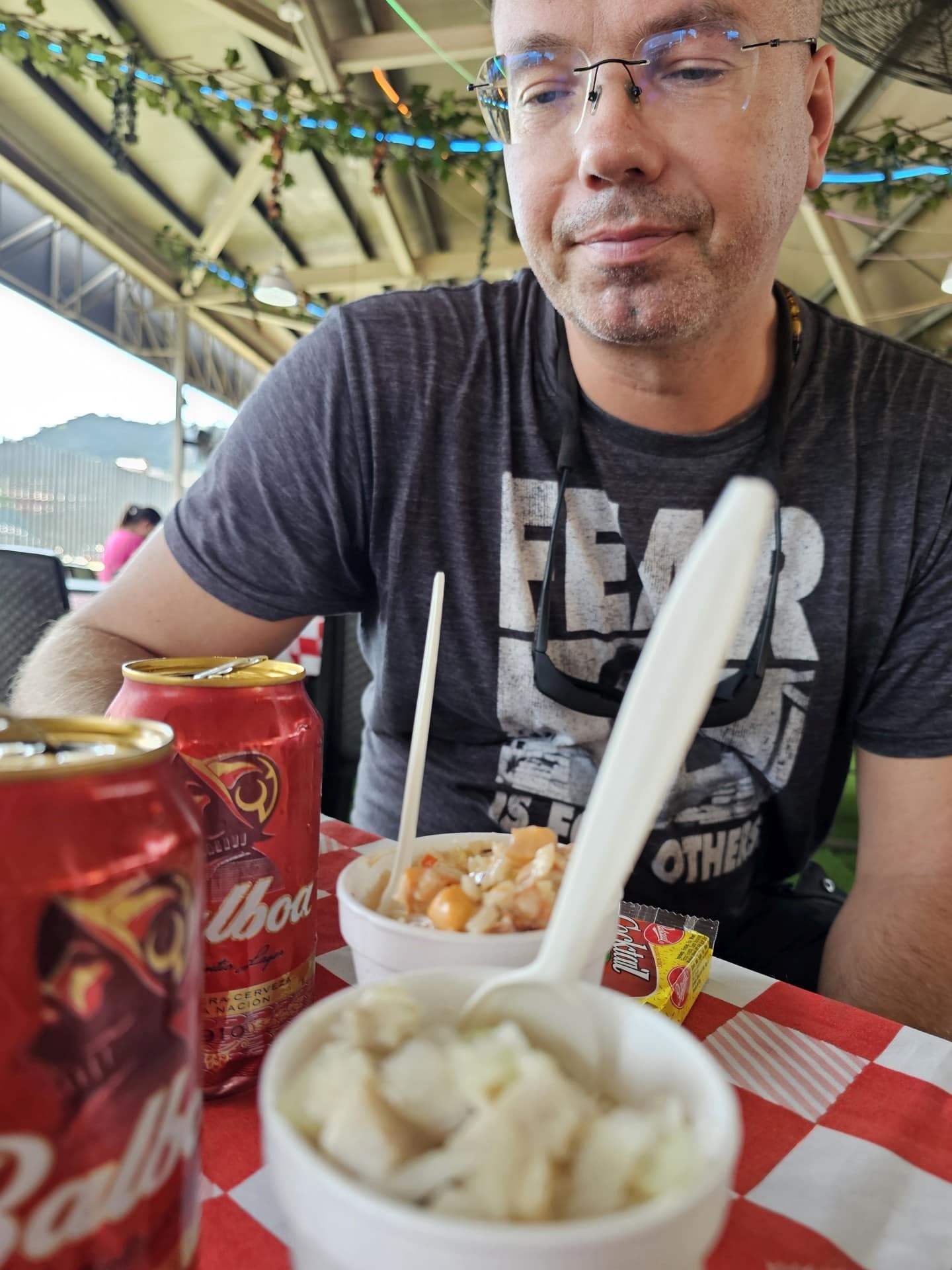 Dnes ideme do Albrook metrom zo 5Mayo. Cestou späť sa dám ostrihať na ulici medzi 5M a Mercado Mariscos za $5. Celkom sa to dedkovi podarilo. Cevichéria oproti rybiemu trhu je zavretá, tak ideme aspoň kúpiť cigary (10×0.50). Dedko je celý rád, i keď nemyslíme, že si nás pamätá. Musí rozmeniť bankovku a za nákup nám ešte pribalí zapaľovač. Dnes ešte nepršalo, takže Unido vybavíme rýchlo a o 12tej ideme do Rana Dorada na happy hour. Majú tam Oktoberfest a mladý časník z Kolumbie nám dá testnúť nejaké špeciály.