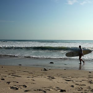 Dnes máme 100tý deňna ceste a tak som si dal darček – kurz surfovania. Vlny sú tu totiž dosť drsné a v El Salvadore mi to moc nešlo, tak som sa rozhodol, že si priplatím. Tak sme sa po výbornej talianskej káve a šiške, ktorá bola síce rozrezaná a tak naplnená nutelou, ale bola čerstvá a chutila výborne, vybrali do najbližšieho surfshopu zistiť viac. Ja som bol na poschodí, Katka na prízemí overovala info o buse. Keďže bola sobota a náš obľúbený židovský podnik a taktiež další, ktorý sme chceli pozrieť boli zavreté, skočili sme do supermarketu po vajká, cuketky a cilantro a Katka spravila na kuchynke lahodnú omeletu. Ja som spravil ovocný šalátik z marakuje a manga, ale nestíhali sme to zatráviť pred surfom o 15:00 tak sme si ho odložili do chladničky na neskôr. V surfshope už čakal malý 29 ročný španielsky inštruktor, ktorý bol síce v Španielsku inžinier, ale rozhodol sa cez krízu, že bude surfer a odišiel do Anglicka. Má zlomené rebro a preto nepôjdeme do zelených vĺn.To sú tie, kde surfujú veľkí chlapci, prvé, ktoré sa tvoria, potom vznikne pena a tá sa ešte dvihne a urobí 1-2 biele vlny. Na brehu mi dosť dlho vysvetľuje bezpečnosť a teóriu a potom ideme na vec. Je akurát príliv, tak to nie je moc sranda, ale podarí sa mi pár krát postaviť. Ideme postupne, najrpv ma roztláča on, potom skúšam už aj pádlovať, nakoniec ide do plytšej aby ma videl zpredu a zboku kde čo robím zle. Pravá je moja zadná noha. Keď sa vlna blíži, treba začať pomaly pádlovať a postupne zrýchľovať. Nemá zmysel začať hned zhurta. Keď cítim náraz vlny treba ešte spraviť 3 zábery, a potom sa bleskurýchle postaviť do surferskej polohy. Zadná noha (sa pokrči ku ľavému kolenu chodidlo na dosku, kolmo na os, ruky do polohy kuracie krídelka, teda dlane na dosku v úrovni začiatku rebier, prsty dopredu, vstávať, zapojiť prednú nohu, taktiež chodidlo kolmo na os vstávať s hmotnosťou rozdelenou rovnomerne medzi obe nohy, predná ruka smeruje na predok boardu a zadá kvôli rovnováhe lakťom do boku, prstami dopredu. Chce to len cvik, ale vlny sú husté a veľa ich je, tak po dostatočnej miere trápenia inštruktor preloží hodinu na ďalší deň ráno, keď bude odliv a jemnejšie vlny. Board si nechávam a ešte to potom do západu bezvýsledne skúšam. Po sprche vygooglime reštauráciu, ktorá je #5 a ideme na grilový tanier. Je to celkom vpohode, aj pizza aj mäso, ale sme trošku sklamaní. Asi sme mali ísť do našej Pasta Basta, ktorá je síce #18, ale tá pizza je neskutočná. Zase som sa riadne nafutroval a tak si kúpim pivko v supermarkete na pretrávenie. Večer je v kuchyni zase celá partička, zaspievam si s nimi Boba a znavený po surferskom „výkone“ nasledujem Katku do stanu.