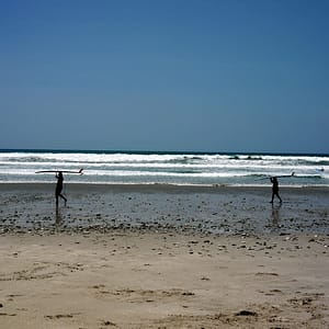 Ráno ideme na surfovaciu hodinu na 09:30, je to trochu lepšie, ale stále žiadna sláva. Po hodine ma lektor necháva a ja to ešte skúšam do 1200, ale pri odlive je už voda taká plytká, že sa oplieskavam a Katka je aj celkom ugrilovaná na pláži, tak ideme na obed po pláži.