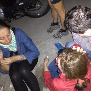 Ťukťukári na nás skúšajú nezmyselne vysoké ceny. Nakoniec sa dostaneme na 180 za ťuk ťuk. Siedmi sa napcháme do troch a uháňame. Asi v polke cesty počujem pred sebou náraz a obiehame akési auto. Pomyslím si, že hádam niekto nehavaroval. Šofér brzdí, otočí to a vraciame sa späť. Ajka je v šoku, Rasťo okolo nej skáče a celkovo je všade kopec paniky. Zisťujeme, že okrem rozrazeného palca a hrče na hlave Ajke nič nie je a pokúšame sa všetkých ukľudniť. Ajku posadíme na kraj cesty, FR jej odborne ošetrí palec a my sa snažíme vyzistiť, či nemá Ajka otras mozgu. Pre istotu a kvôli prípadnej návšteve doktora chceme policajnú správu. Šofér auta, do ktorého trúbiaci ťukťukár napáral je dosť nervózny. Začne tým, že má v dome mŕtvolu. Očividne by sa z celej situácie čo najskôr vyzul. Pofotíme si ŠPZtky všetkého, čo sa dá a čakáme čo bude. Náš ťukťuk už niekam nepôjde – celý je dokrkvaný. Auto má len trošku ťuknutý nárazník. Keďže tam len tak postávam ako drúčik chodí za mnou šofér auta orodovať, aby sme nešpekulovali s policajtami, že to bude nadlho. Policajti prídu a keďže chceme správu, začnú si zapisovať na papier. Keď si to chceme vyfotiť, chlapík nám ukáže nezrozumiteľné čmáranice. Správu nám na mieste nedá, môžeme sa zastaviť neskôr na policajnej stanici. Šofér auta je dosť vystresovaný, vypráva mi, ako prišiel na pohreb z Nórska, požičal si na letisku auto a prišiel akurát do domu k nebožtíkovi. V Nórsku je už 20 rokov, to by vysvetľovalo, prečo nechápal trúbenie ťukťukára. Zase je pravda, že sme frčali na ťukťuku ako blázni. Ja mám tak trochu pocit, že či šofér auta nemal aj vypité. Roman už nechce sadať do trojky do ťukťuku, tak si nakoniec priobjednáme ešte jeden extra Roman ide s našimi vakmi. Zvyšok cestu je už bez incidentov.