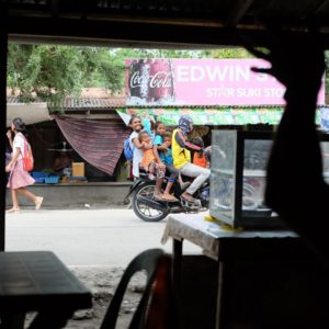 Z tieňa lokálu pozorujeme lokálnu scénu. Oproti nám je benzínka, kde domorodci kupujú benzín v litrových sklenených fľašiach od Pepsi. Natankujú a podaktorí, ak prišli z iného smeru otočia motorku na stojane on 180 stupňov a poďho si po svojom. Na motorke idú bežne aspoň štyria. Zvyčajne celá rodinka. Niektoré väčšie motorky majú vzadu dorobené extra sedátko, a niekedy je malá sedanka aj pod kormanom.