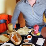 Obedujeme v hektickej vegetariánskej reštike, kde nás podsadne kopa ľudí, kým si vyberáme 7 položiek z menu. Polievku, nápoj, šalátik, fašírky a prílohy.
