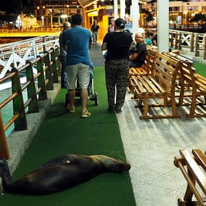 Cez kanál nás berie preplnená loďka a potom sa potíme v buse a čakáme, kým nepríde posledná loďka s pasažiermi z letiska. Ideme vyše hodinu cez 5 vegetačných pásiem. Pri brehu je sucho a vo vrchovine je džungľa. V nepeknom mestečku – Puerto Ayora na opačnej strane ostrova hľadáme ubytko a dosť sa pri tom zapotíme. Taktiež sme odvykli od 30C teplôt. Ceny sú tu dosť brutálne. Nakoniec končíme s 33.60USD bez klimatizácie. Večeriame v lokálnom grile, bezmäsitú večeru, lebo kura sa nám moc nepozdáva. V prístave pozorujeme uškatce na móle. Keď zapadne slnko a mierne prefukuje, je celkom príjemne teplo, odhadujem tak 26C.
