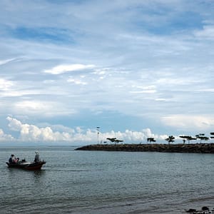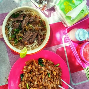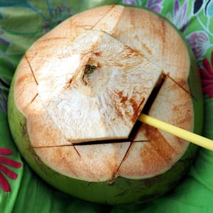 Potom už sa vraciame po západnej strane čaká nás 9km pekných pláží. Zastaneme na prvej, kde maju rybári pár člnov a babky v tieni vnútrozemia čakajú s obedom. Presunieme sa na druhú so školou na pláži. Okúpeme sa a schováme do tieňa. Zase musí byť dnes slnečný deň, keď sme konečne vonku? Nikde nie je nikto na pláži, len babka s malou na trojkolke prefrčia okolo. Je riadny odliv a nechce sa nám moc prechádzať v plytkej vode, tak si len rochníme vo vode po plavky. Začína sa hlásiť hlad, tak zaparkujeme (samo že v protismere) pri zhluku murovaných stánkov. Usadíme sa v domčeku s palmovou strechou a pochutnáme si na hovädzej polievočke a kotje s kuraťom (široké rezance). Potom sa vyvalím do húpacej siete, lebo palmová strieška bola trochu deravá a báli sme sa, že nás priškvrkne. Objednáme si ešte kokos. Ten je teplý, ale taký megaveľký, že ho pijeme asi hodinu. Má len tenunký povlak dužiny, ktorú na záver zoškrabkáme prinesenou lyžicou. Za celý obed s ľadovou kávou a ľadovým čajom a megakokosom na pláži platíme 19R (4.2EUR)