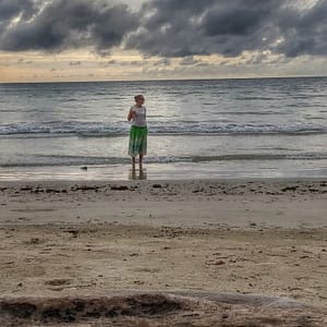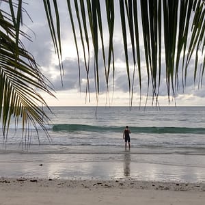 Vyrážame na úplný juh, kde to pri golfovom ihrisku s výstražnými tabuľami, že budú strielať otáčame a v drobnom dáždiku sa s ľadovou kávou a čajom schovávame pod palmu na pláži. Je tu síce pekný piesoček, no máme ešte čas a benzín v nádrži a rozpršieva sa tak sa rozhodneme vybehnúť späť na sever po kokos. Tam už fajne prší, tak posledné kúpanie je v daždi. Napriek kokosu sme hladní a rozpoltení, či ísť už do mesta na pizzu, alebo ešte zostať na západ slnka.