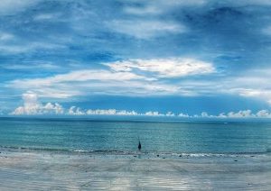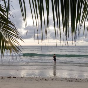 Vyrážame na úplný juh, kde to pri golfovom ihrisku s výstražnými tabuľami, že budú strielať otáčame a v drobnom dáždiku sa s ľadovou kávou a čajom schovávame pod palmu na pláži. Je tu síce pekný piesoček, no máme ešte čas a benzín v nádrži a rozpršieva sa tak sa rozhodneme vybehnúť späť na sever po kokos. Tam už fajne prší, tak posledné kúpanie je v daždi. Napriek kokosu sme hladní a rozpoltení, či ísť už do mesta na pizzu, alebo ešte zostať na západ slnka.
