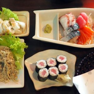 Majú tu dve živé murény, po skle behajúce hviezdice a ježovky, pestré tropické akvárko s apoň desiatimi rôznymi sasankami, škaredé stonefish (najjedovatejšie ryby) a veľké ploché ryby. Na poschodí sú zbierky mušlí a makety rýb žijúcich v tunajších vodách. Taktiež udice, siete a pasce a kope historického a dokumentárneho fotomateriálu. Hlad nás ale ženie von a zapadneme do susediaceho a už spomínaného božského suši. Obsluha je v kimonách a i keď je tu tiež malý bežiací pás a obedné menúčka, vyzerá to, že to má úroveň. Odhodláme sa preto skúsiť netradične aj niečo tepelne spracované. Tenké hubky na cesnaku, grilovaná sépia a fritované rybky plné ikier. Samozrejme nechýbalo ani miešané sašimi a nejaká tá rolka – maki.