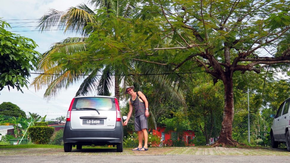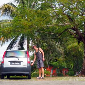 Od ukecanej Indky z NewDelhi, ktorá je od 1984 vydatá na Labuane, si Sandokan a Perla Labuánu – to ako my – požičiavajú to najlacnejšie autíčko (50) a vrhajú sa do protismernej premávky. Jazdí sa tu naľavo a aj radiaca páka je naľavo. Už je mi jasné, prečo mi ponúkala teta automat. Mal by som o starosť menej a mohol sa o to kľudnejšie venovať stieračom miesto blinkeru, šmátrať pravačkou vo dverách miesto radenia a hrať sa na posilňovač riadenia. Aspoň že pedále sú normálne a klíma funguje. Tankujeme za 10 no najprv nastáva kowbojka pri preparkovávaní. Za 2,20EUR natankujeme 4,7L 95ky benzínu. Na ostrove dlhom 16 km to neprejazdíme ani s klímou na max. A to chceme primárne kvasiť na plážach. Ale skútre tu nerentujú. Ideme podľa navigácie a som rád za semafóry a vodiace čiary v križovatkách. Asi majú s turistami zvyknutými jazdiť vpravo vlastné skúsenosti. Keď končíme pred bránou JRD, je jasné, že v navigácii máme zasa raz peší mód a necelé tri minúty na sever ostrova boli dve hodiny aj 45 minút.