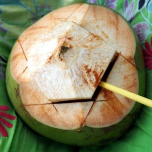 Potom už sa vraciame po západnej strane čaká nás 9km pekných pláží. Zastaneme na prvej, kde maju rybári pár člnov a babky v tieni vnútrozemia čakajú s obedom. Presunieme sa na druhú so školou na pláži. Okúpeme sa a schováme do tieňa. Zase musí byť dnes slnečný deň, keď sme konečne vonku? Nikde nie je nikto na pláži, len babka s malou na trojkolke prefrčia okolo. Je riadny odliv a nechce sa nám moc prechádzať v plytkej vode, tak si len rochníme vo vode po plavky. Začína sa hlásiť hlad, tak zaparkujeme (samo že v protismere) pri zhluku murovaných stánkov. Usadíme sa v domčeku s palmovou strechou a pochutnáme si na hovädzej polievočke a kotje s kuraťom (široké rezance). Potom sa vyvalím do húpacej siete, lebo palmová strieška bola trochu deravá a báli sme sa, že nás priškvrkne. Objednáme si ešte kokos. Ten je teplý, ale taký megaveľký, že ho pijeme asi hodinu. Má len tenunký povlak dužiny, ktorú na záver zoškrabkáme prinesenou lyžicou. Za celý obed s ľadovou kávou a ľadovým čajom a megakokosom na pláži platíme 19R (4.2EUR)