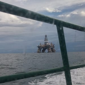 Plávame aj okolo vrtnej veže Deepwater Nautilus, ten istý model, ako katastrofický Deepwater Horizon, ktorý buchol British Petrolu v 2011.