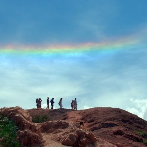 Nakoniec sa napapkáme a ideme na bus o hodinu neskôr. Ideme do včera plánovanej Purmamarky, pozrieť sa na sedemfarebný kopec. Ideme 26km, no cestou naplníme bus domácimi, ktorí tam asi idú za prácou v turizme. Zo stanice ideme do informačnej agentúry na námestí. Tá je síce otvorená, no nikde nikto. Majú tam ale úschovňu batožiny. A mali ju aj na iných miestach, takže fpohode sa to dá robiť ako zastávka na ceste hore dolinou. Ideme okolo kopca, kde sme videli pred chvíľkou ľudí, no nedá sa naň výjsť. Obehneme ho hore dedinou a tam už vyberajú 3ARS za vstup. Vstup je celodenný, tak si povieme, že sa ešte vrátime okolo obeda, kedy má byť najlepšie svetlo. Vyšlapeme na kopec, sme tam sami a fotíme parádny výhľad na sedemfarebný kopec. Zbehneme dole a dozvedáme sa, že ešte môžeme po 45minútovom chodníku obehnúť farebné kopce a vidieť iné, údajne zaujímavé veci. A tak sa aj stalo. Cesta bola zaujímavá, ale už bolo aj celkom teplo a pieklo slnko. Pekné hlinené kopce boli rozerodované dažďom. Skalnaté kopce porastené kaktusmi a machmi. Na jeden estetický kopček si vybehneme a takí sme z nadmorskej výšky zadýchaní, že si v jeho tieni založíme pár kokových lístkov. Pre tých, čo si pomyslia, že akí sme závisláci, poviem len toľko: cestou dole prifrčal pikap, z korby zoskočili tri 4 ročné decká a rozbehli sa hore kopcom oproti nám. Po 10 sekundách prvá baba zavelila stop. Že už nevládze. A tiež bola zadýchaná. Takže to nebolo subjektívne. Museli sme sa jednoducho nastreliť. Ešte sme chvíľu šli po ceste do kopca do malého priesmyku a potom sme už len klesali. Videli sme iné farebné kopce, trsy kvetov obzučiavané včelami, erodované svahy, čo vyzerali ako rodinka na pláži, cintorín pripomínajúci mesto a 7 farebné kopce zo zadu.