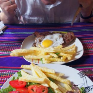 Na recepcii nám – už chlapík – odporučil podnik, kde nám bude stačiť jedno jedlo. A veru že mal pravdu. Bolo tam síce mrte múch, ako keby sme obedovali v kravíne ale zrovnateľne s našim hostelom a K bolo z toho viac než mierne vystresovaná, ale najedení sme už boli z polievky. Potom prišli – na jednom tanieri ako jedna porcia – dva stejky na hore hranoliek – každý s vlastným volským očkom. Rozdelili sme to na priložený prázdny tanier. Mali sme dve parádne porcie. Aj sme si to odfotili. Ledva sme to zfutrovali. Parádne mäsko s kostičkou – costeleta. Vyzeralo to byť ako horná roštenka z teľaťa. Možno aj s kúskom sviečkovej. Fajné mäsko, i keď trochu húževajtejšie, ale s lahodnou slaninkou na kraji. Dostali sme aj dezertík, nejaké to ovocné želé. To celé za 50ARS, 3.52, ako menúčko pre jedného v PD. Nafutrovaní, teda aspoň ja, lebo som dojedal Katkine mäsko, sme boli až do večera.