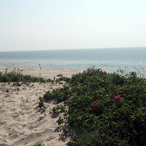 Curonian Spit je 98km dlhá piesková naplavenina pred pobrežím Litvy a Kaliningradskej oblasti (Rusko) – chránená UNESCO. Miestami je dunami a lesom pokrytý polostrov 400m široký, niekde ma šírku aj 3.8km. Ideme na prvú pláž. Nevieme sa dočkať kúpania v mori. Na parkovisku je veliký stan, kde čapujú pivo a predávajú nanuky. Medzi parkoviskom a plážou je vysoká duna porastená divými šípkami, ktoré v teple omamne voňajú. Cez dunu ideme po schodoch. Pod nami sa rozprestiera pláž bieleho piesku a kľudné zelenkavé more. To je málo slané a pomerne svieže. Teplota vody sa aj v najvyššom lete vyšplhá na max 23C, my máme niečo medzi 19-21C. Na slnku je vo vetríku príjemne, no keď si postavíme slnečník, je nám po chvíli zima. Tak ho musíme zbaliť. Snáď hneď v prvý deň nezhoríme. Z pláže ideme jednou jedinou cestou, ktorá ide až do Ruska nájsť si niečo na večeru. Po asi 20km je prvá dedinka – Juodkrantė. Pôsobi celkom malebne, tak keď už prejdeme okolo druhej reštaurácie zastaneme na parkovisku popri ceste. Je príjemné jesenne vyzerajúce slniečko a sme na záveternej strane obrátení ku pevnine. Ľudia tu majú krásne upravené záhradky a z malých búdok všade predávajú údené ryby. Sú tu len dve reštiky, tak zapadneme do tej s krajšou záhradou. Máme super stôl v strede, pod jabloňkou. Okolo nás rozvoniavajú rôznofarebné ľalie. Dávame su super pivá od klaipédskeho pivovaru Švyturis. Obe sú za dve eurá. Biele belgické je s plátkom citrónu. Keďže sme sa už nadlábli údenou makrelou na promenáde, pivko zajedáme hrachom s údeninou a krúžkami z kalamára. Dedinka sa nám veľmi pozdáva a slnko zapadá až okolo 22:00.