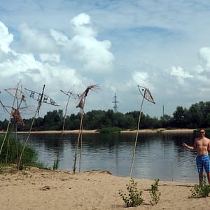 Cesty sú celkom fajn, no postupne ako sa prepracovávame do delty rieky Nemuno, ideme stále po užších a miestami dosť dobitých cestách. V delte končíme v dedinke Rusné. Majú tam jeden obchodík s nakladanými a údenými rybami, prekvapivo veľkým výberom piva, potravinami a potrebami pre domácnosť. Informácie sú ako vždy zavreté. Berieme teda pivo na pláž ku rieke. Haluz je, že plechovky majú objem imperiálnej pinty, teda 568mL. Fľaše sú niektoré pollitrové, no niektoré vysoké atypy sú zase pintovej veľkosti. Každý výrobca má aj pšeničné nemeckého alebo francúzskeho/belgického typu. Pri rieke si sadneme do piesku v tieni stromu a odvážnejší sa idú okúpať do vody. Breh zdobia ryby upletené z prútia nastoknuté na dlhých paliciach. Je tu celkom fajn, lebo je už pracovný deň. Ku koncu našej obednej prestávky ale začnú prichádzať kúpaniachtivé deti zo školy.