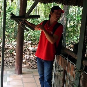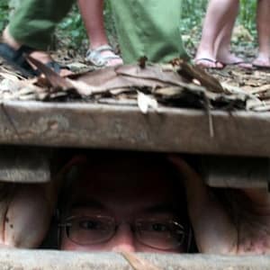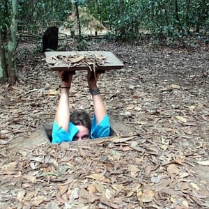 Keď sa už blížime k tunelom spomenie ešte pár relevantných informácií, že tunelov je viac ako 200km a v oblasti žilo 16000 ľudí. A taktiež, že si môžeme na záver zastrieľať zo zbraní (mali aj americké M16 aj ruské AK47), no pri kúpe je minimum 10 guliek. Sprievodca vyzbiera po 90.000D na hlavu za vstupné a kým celá posádka busu okupuje WC donesie lístky naspäť. Beháme po lese s množstvom iných skupiniek, zastavujeme sa pri vchode do tunela, kde si každý skúsi vliezť a odfotí sa (teda s nie príliš veľkým zadkom) . Nad hlavou drží drevený kryt s lístim, aby nebolo vchod vidno. Po pár turistoch je už všetko lístie z krytu preč, tak si nakladáme vlastné. Beháme okolo amerických tankov ktoré tam zahynuli, okolo bunkrov, ktoré sú teraz už vykopané a majú strechy pokryté lístím. Chalan nám ukazuje termitie kopy, ktoré nie sú termitími kopami, ale vetračkami. Tunely potrebovali čerstvý vzduch a hrubá bambusová rúra bola zakopaná hlboko do zeme, aby pokryla viacero úrovní tunelov a v kope sú popri zemi diery, cez ktoré vzduch prúdil do hlavnej rúry. Na inom mieste podobná kopa slúži ako komín, cez malé dierky vidno trochu dymu a aj keby ho nepriateľ spozoruje, nevie, kdeje samotná kuchyňa. Z diaľky sa ozýva streľba, tak máme celkom dobrú kulisu. Už len napalm tu chýba. Zastavujeme pri pasciach, ktoré používali okolo svojich obydlí, alebo v tuneloch, ak ich nepriateľ prenasledoval. Je tu nespočetne rôznych pascí, od preklopných, kde človek stúpi a padne na bambusové ostne až po ostnaté palice, ktoré zakopávali do rieky a ryžových polí. Pri konštrukcií pascí sa očividne fantázii medze nekládli. Pascový výklad uzatvárame souvenir trapom (suvenírová pasca), čo vyzerá ako väčšia klietka s háčikovitými ostňami z vnútra dookola zakopaná v zemi. Keď do nej niekto stúpi, nohu už nevyberie, ale ak je dosť silný môže si pascu zobrať zo sebou, dať sa ošetriť u lekára a má pascu ako suvenír.