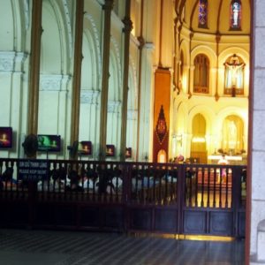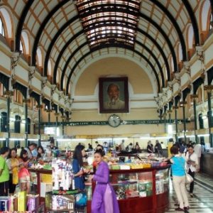 Ozývajú sa tráviace problémy, tak beháme okolo tržnice a vyhliadame toaletu. Nakoniec zapadáme v parádnom mrakodrape, kde K využíva čakací čas obzeraním obchodov. Cestou ďalej objavíme uličku s foto obchodmi, kde skúšame zistiť, či by nám opravili foťák. Veľa obchodov má priamo v priestoroch opravovňu. Neklapne to a nepodarí sa nám ani kúpiť obal. Jeden maník sa ho už chystá rozmontovať a po 30 opýtaní sa na cenu zoberie kalkulačku a suverénne zaťuká čislo 200, vysvitne že dolárov, tak sa porúčame. Zastavíme sa v obchoďáku, kde majú na prízemí parfumériu a veci ako v Nemecku, ale potraviny sú tam biedne a voda dokonca drahšia ako na ulici. Dole ale majú pekné voňavky v porcelánových flakónoch tvaru ženy s typickými klobúkmi jednotlivých regiónov Vietnamu. Sme už dosť hladní a tak si pred Notre Damom kupujeme ryžovú polievku za 20.000 D. Keď vidíme aké nerastlinné veci nám tam milá teta od pojadznej vývarovne chce dať – niečo čo vyzeralo ako surová slanina, tak ju ukecávame, že ‘no meat’ – bez mäsa, tak pridá niečo ako posúch. Sadneme si na obrubník s výhľadom na červený kostol a hútame, či v parádne vyzerajucej budove na strane námestia nie je nejaká tržnica, kde by sme dostali fajnovejšiu papkačku. Chodí tam kopa ľudí. Dokončíme pekne polievku a ideme sa tam kuknúť aj my. Heh, dobre, že sme si dali polievku, lebo milá budova je centrálna pošta navrhnutá samotným G. Eiffelom. Máme už dosť, tak si pozrieme omšu v kostole, kde používajú monitory s videom a textami ako na karaoke, zoríentujeme sa podľa navigošky a poď ho na hotel. Suši ešte nie je a mám chuť na zmenu, tak končíme v mexickom podniku na rohu na pizzu, kde boli baby prvú noc. Pizza je drahá ako sviňa a pivo ako tri svine ale dá sa. Dopisujem denník.