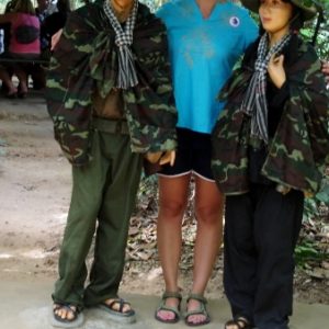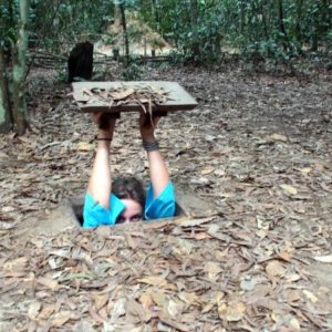 Keď sa už blížime k tunelom spomenie ešte pár relevantných informácií, že tunelov je viac ako 200km a v oblasti žilo 16000 ľudí. A taktiež, že si môžeme na záver zastrieľať zo zbraní (mali aj americké M16 aj ruské AK47), no pri kúpe je minimum 10 guliek. Sprievodca vyzbiera po 90.000D na hlavu za vstupné a kým celá posádka busu okupuje WC donesie lístky naspäť. Beháme po lese s množstvom iných skupiniek, zastavujeme sa pri vchode do tunela, kde si každý skúsi vliezť a odfotí sa (teda s nie príliš veľkým zadkom) . Nad hlavou drží drevený kryt s lístim, aby nebolo vchod vidno. Po pár turistoch je už všetko lístie z krytu preč, tak si nakladáme vlastné. Beháme okolo amerických tankov ktoré tam zahynuli, okolo bunkrov, ktoré sú teraz už vykopané a majú strechy pokryté lístím. Chalan nám ukazuje termitie kopy, ktoré nie sú termitími kopami, ale vetračkami. Tunely potrebovali čerstvý vzduch a hrubá bambusová rúra bola zakopaná hlboko do zeme, aby pokryla viacero úrovní tunelov a v kope sú popri zemi diery, cez ktoré vzduch prúdil do hlavnej rúry. Na inom mieste podobná kopa slúži ako komín, cez malé dierky vidno trochu dymu a aj keby ho nepriateľ spozoruje, nevie, kdeje samotná kuchyňa. Z diaľky sa ozýva streľba, tak máme celkom dobrú kulisu. Už len napalm tu chýba. Zastavujeme pri pasciach, ktoré používali okolo svojich obydlí, alebo v tuneloch, ak ich nepriateľ prenasledoval. Je tu nespočetne rôznych pascí, od preklopných, kde človek stúpi a padne na bambusové ostne až po ostnaté palice, ktoré zakopávali do rieky a ryžových polí. Pri konštrukcií pascí sa očividne fantázii medze nekládli. Pascový výklad uzatvárame souvenir trapom (suvenírová pasca), čo vyzerá ako väčšia klietka s háčikovitými ostňami z vnútra dookola zakopaná v zemi. Keď do nej niekto stúpi, nohu už nevyberie, ale ak je dosť silný môže si pascu zobrať zo sebou, dať sa ošetriť u lekára a má pascu ako suvenír.