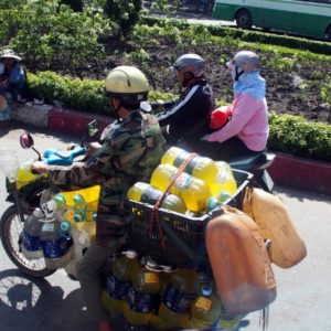 Na motorke sú často aspoň dvaja a cesta vyzerá ako more ľudí v prilbách, hlava/prilba na hlave. Je to fascinujúce a pri každej veľkej križovatke sa nad tým pozastavujem, ako tá masa ľudí zhustne a potom na zelenej sa to trošku rozťahá. S autami by sa sem ani nepomestili, určite nie desať dvanásť vedľa seba na dvojprúdovke.