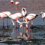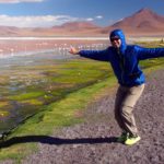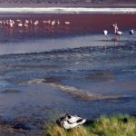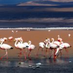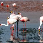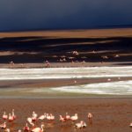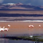 Plameniakové jazero – Laguna de Colorada je nepopísateľná. Všade v diaľke sú ružové bodky – plameniaci na červenom a bielom pozadí. Voda je zfarbená mikroorganizmami na červeno – z toho majú aj plameniaci červenú a ružovú farbu. Na niektorých miestach sa borax vyzrážal z vody a tvorí ostrovčeky podobné snehu. Pri brehu sa zgrupovali plameniaky pri prítokoch čerstvej vody a pili na striedačku ako nejaká mašinka – kľuková hriadeľ. Nemo sme sedeli na brehu a pozorovali ich v ich haluznej činnosti. Ak sa nejaký tupý turista priblížil moc blízko, vybrali sa plameniaky hojdavým krokom v rade za sebou na iné miesto pri brehu. Máme tu rozchod jednu hodinu, ale ani zďaleka to nestačilo. Ešte by sme tam hodinu dve vydržali. Parkovali sme na polostrovčeku a vôbec sme si ho ani neobehli.
