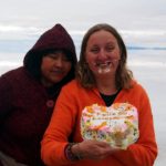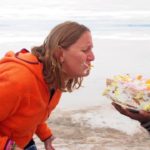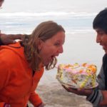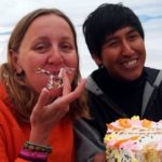Keď sme už celí premočení a premrznutí, ide sa na raňajky. Tie si rozbalíme v kufri Landcruisera. Nestihnem sa ani poriadne obuť a už utekám s foťákom fotiť Katkine gratulácie. Podľa Bolívijského zvyku jej capnú tvár do torty. Tá bola inak naozaj pekná. Na to, že o jej narodkách ešte deň dopredu nevedeli a použili iba pár limitovaných surovín, torta vyzerá úplne perfektne. Korpus tvoria dva pláty palacinkového cesta zlepené raňajkovým džemom a dulce de leche. Taktiež vrch je zdobený dulce de leche a farebnou penou. Ku gratuláciám a spevu v dánčine sa pripájajú aj gratulanti a speváci po francúzsky, portugalsky, anglicky, kečuánsky, španielsky a dokonca aj z Izrealského auta. Izrealci K namaľujú poster po hebrejsky a K sa s nimi fotí.
