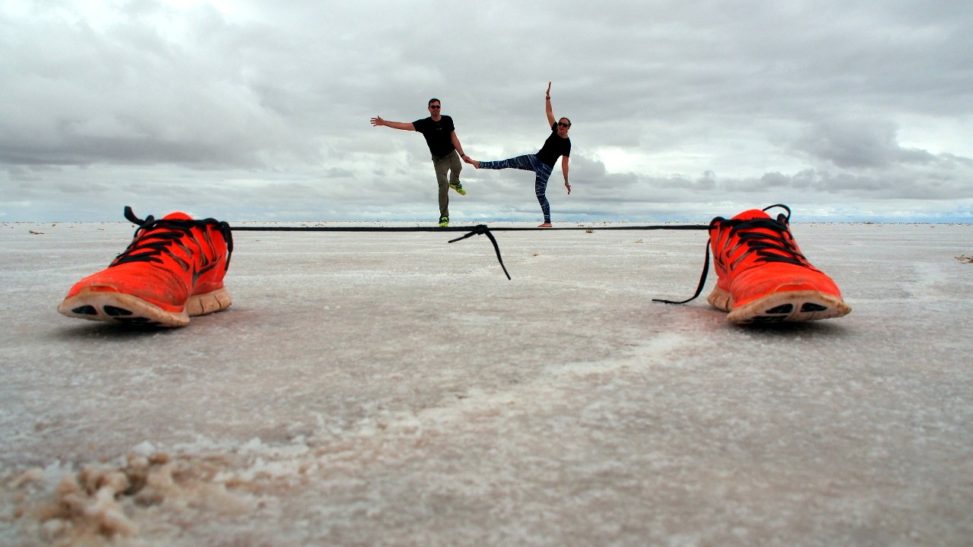 Fotenie na suchej soli je síce bez odrazov, ale aspoň sa nezamočíme a na niektoré efekty odrazy vo vode vyslovenie vadia. Každý sa snaží vymyslieť čo najoriginálnejší záber, no tým, že sa hráme s perspektívou a subjekty sú často vo vzdialenosti niekoľko desiatok metrov je komponovanie z ruky dosť problematické. Obzvlášť keď sú predmety aj v troch rôznych rovinách. Silne odporúčam zobrať si statív, lebo sebamenší pohyb ruky držiacej foťák rozbije kompozíciu nekonečna na prach. Robili sme napríklad video – beh ľudí z jednej fľaše do druhej. A aj keď sa K podaril štart vyladiť perfektne, na konci sme už vybiehali na fľašu, namiesto do nej. Nekonečný horizont a neexistujúca mierka dáva kreativite skutočne krídla.