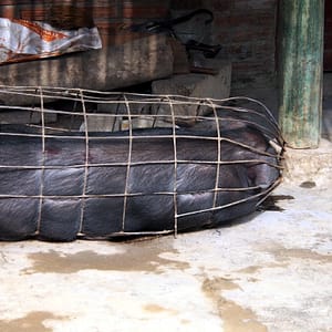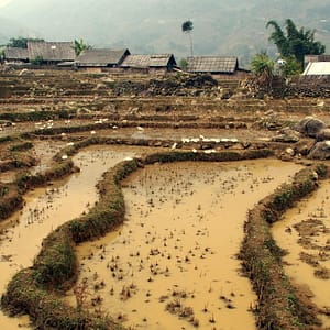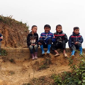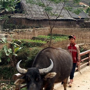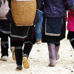 Sprievodca sa vráti s lístkami, prevedie nás cez trh, kde sme už boli včera a ideme smerom ku Sapa Sisters. (SS) Pred SS je horda belochov a domorodcov v krojoch. Kúsok ďalej sa konečne otvárajú výhľady do doliny. Fotíme o 106 a tie hordy zo SS nás dobiehajú. Je nás teraz cez 50. Z nášho sprievodu 4roch domorodcov sme dve ženy striasli. Ideme stále dole kopcom. Výhľady sú dramatické, i keď práve nie je ideálna sezóna. Ryža je zozbieraná, novú budú sadiť až v apríli a všetko sú len odtiene hnedej. Predbiehame sa s ostatnými skupinkami ako jedny alebo druhý fotia. Je to fajn, počasie nám praje, ale sprievodca nie je moc nadšený svojou prácou a nejako prehnane s nami nekomunikuje. $15 za túto prechádzku sa mi zdá moc veľa. Odporúčam radšej sledovať hordy, alebo sa len tak prechádzať podľa nejakej mapy. Na spodku doliny po prechode cez rieku dostávame obed – polievku, banány a jogurt. Pred jedlom sme oblokelesní väčším množstvom domorodkýň a malých dievčatok, všetky chcú všetko predať. Je to viac než nepríjemné. Zachraňujú nás naši HK spolupútnici, ktorí kupujú až až suvenírov. Posilnení pokračujeme cez dedinu prezrieť si výrobu konopného plátna a farbenia indigom na modro. Pred workshopom je ai štvormetrová konopa, do troch metrov kam dosiahnem otrhaná, iba kmeň na spodu hrubý ako vianočný stromček a na vrchu zopár vetvičiek. Asi im ten spodok už ošklbali turisti na marišku. Sprievodca to aj tak veľavravne vyslovuje, keď sa na jeho anglickú verziu slova konpe nikto nechytá, tak použije propagandistický názov marijuana, čo by už skutočne mal chápať každý. Pred budovou je vodné klepadlo na mlátenie ryže. Stekajúca voda naplní nádovu, ta dvihne kladivo, voda sa vyleje a kadivo padne do nádoby s nevymlátenou ryžou. Vnútri je mlyn na ryžovú múku, celkom mi to ide na rozdiel od Azoušov, len si zo mňa sprievodca robí srandu, že to by deti dho čakali na raňajky keby meliem takýmto tempom. Chalan nám ukáže ako sa spriadza vlákno a pani ako sa z toho tká plátno. Azouši ho moc nesledujú a cvakajú si naokolo, z čoho je sprievodca dosť rozčarovaný a pokúša sa – neúspešne získať pozornosť. Asi sme už trochu pozadu, lebo nahadzujeme pružnejšie tempo. Prechádzame okolo obchodov s kamennými výrobkami, školami, obydliami, obyvateľmi v iných krojoch, destilačkou kde zvedaví turisti koštujú ryžové pálené, výrobcami vonných tyčiniek, rybníkmi plnými kačkami a ryžovými poliami. Stále dole kopcom až nakonci za riekou je strmé 15 minútové stúpanie na cestu, kde nastupujeme do busu, čakáme ešte na dve skupinky a ideme naspäť. Krajina krásna ale tá masovosť sa nám nezdá. Chcelo by to prísť v teplejšom období a obehať to na motorke za pár dní na vlastnú päsť. Tento rok je vraj mimoriadne chladný, tesne pred našim príchodom napadol sneh, čo nie je bežné. Zima je riadna i keď slniečko sem tam zahrievalo. Aj ten výšľap (záverečný) pomohol.