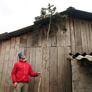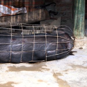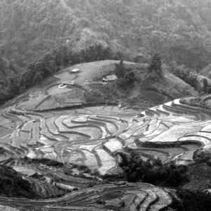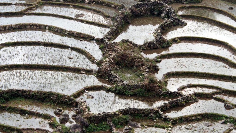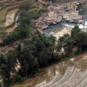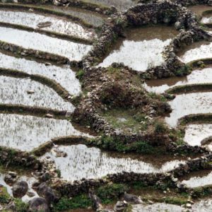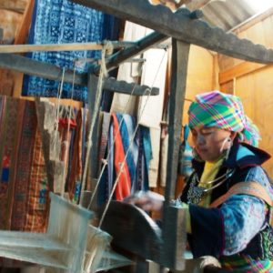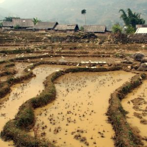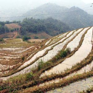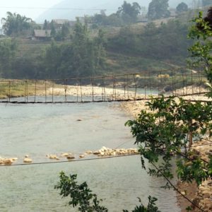 Sprievodca sa vráti s lístkami, prevedie nás cez trh, kde sme už boli včera a ideme smerom ku Sapa Sisters. (SS) Pred SS je horda belochov a domorodcov v krojoch. Kúsok ďalej sa konečne otvárajú výhľady do doliny. Fotíme o 106 a tie hordy zo SS nás dobiehajú. Je nás teraz cez 50. Z nášho sprievodu 4roch domorodcov sme dve ženy striasli. Ideme stále dole kopcom. Výhľady sú dramatické, i keď práve nie je ideálna sezóna. Ryža je zozbieraná, novú budú sadiť až v apríli a všetko sú len odtiene hnedej. Predbiehame sa s ostatnými skupinkami ako jedny alebo druhý fotia. Je to fajn, počasie nám praje, ale sprievodca nie je moc nadšený svojou prácou a nejako prehnane s nami nekomunikuje. $15 za túto prechádzku sa mi zdá moc veľa. Odporúčam radšej sledovať hordy, alebo sa len tak prechádzať podľa nejakej mapy. Na spodku doliny po prechode cez rieku dostávame obed – polievku, banány a jogurt. Pred jedlom sme oblokelesní väčším množstvom domorodkýň a malých dievčatok, všetky chcú všetko predať. Je to viac než nepríjemné. Zachraňujú nás naši HK spolupútnici, ktorí kupujú až až suvenírov. Posilnení pokračujeme cez dedinu prezrieť si výrobu konopného plátna a farbenia indigom na modro. Pred workshopom je ai štvormetrová konopa, do troch metrov kam dosiahnem otrhaná, iba kmeň na spodu hrubý ako vianočný stromček a na vrchu zopár vetvičiek. Asi im ten spodok už ošklbali turisti na marišku. Sprievodca to aj tak veľavravne vyslovuje, keď sa na jeho anglickú verziu slova konpe nikto nechytá, tak použije propagandistický názov marijuana, čo by už skutočne mal chápať každý. Pred budovou je vodné klepadlo na mlátenie ryže. Stekajúca voda naplní nádovu, ta dvihne kladivo, voda sa vyleje a kadivo padne do nádoby s nevymlátenou ryžou. Vnútri je mlyn na ryžovú múku, celkom mi to ide na rozdiel od Azoušov, len si zo mňa sprievodca robí srandu, že to by deti dho čakali na raňajky keby meliem takýmto tempom. Chalan nám ukáže ako sa spriadza vlákno a pani ako sa z toho tká plátno. Azouši ho moc nesledujú a cvakajú si naokolo, z čoho je sprievodca dosť rozčarovaný a pokúša sa – neúspešne získať pozornosť. Asi sme už trochu pozadu, lebo nahadzujeme pružnejšie tempo. Prechádzame okolo obchodov s kamennými výrobkami, školami, obydliami, obyvateľmi v iných krojoch, destilačkou kde zvedaví turisti koštujú ryžové pálené, výrobcami vonných tyčiniek, rybníkmi plnými kačkami a ryžovými poliami. Stále dole kopcom až nakonci za riekou je strmé 15 minútové stúpanie na cestu, kde nastupujeme do busu, čakáme ešte na dve skupinky a ideme naspäť. Krajina krásna ale tá masovosť sa nám nezdá. Chcelo by to prísť v teplejšom období a obehať to na motorke za pár dní na vlastnú päsť. Tento rok je vraj mimoriadne chladný, tesne pred našim príchodom napadol sneh, čo nie je bežné. Zima je riadna i keď slniečko sem tam zahrievalo. Aj ten výšľap (záverečný) pomohol.