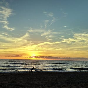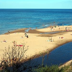 Pláž je super, voda ide rýchlo do hĺbky, takže netreba prešlapať polcestu do Švédska, aby sa človek omočil. Piesok je hnedastý, ľudí veľa ale miesta ešte viac. Pláž od hlavnej cesty oddeľuje borovicový lesík. Všade vládne príjemná dovolenková atmoška. Všetci sú radi, že sú pri mori.