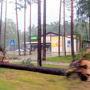 Večer príde búrka ako vystrihnutá z predpovede s krúpami a fukotom. Asi vypadne elektrika, lebo supermarket je tmavý. Chceme ešte niečo prikúpiť na večeru, tak ideme cez mesto na druhú stranu, no všade je tma a mestom sa zjavne prehnala smršť. Na ceste sú povyvracané stromy, dve autá rozbité už popílenými stromami a všetky obchody zavreté.