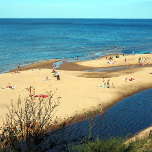 Pláž je super, voda ide rýchlo do hĺbky, takže netreba prešlapať polcestu do Švédska, aby sa človek omočil. Piesok je hnedastý, ľudí veľa ale miesta ešte viac. Pláž od hlavnej cesty oddeľuje borovicový lesík. Všade vládne príjemná dovolenková atmoška. Všetci sú radi, že sú pri mori.