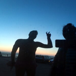 Parkovisko na pláži je platené až do 21h, parkujeme teda cez cestu pri supermarkete Elvi. Plážujeme až do tmy, západ nesklame. Konečne v premiére využijeme aj náš rok starý plážový gauč. Je to luxus.