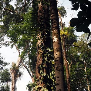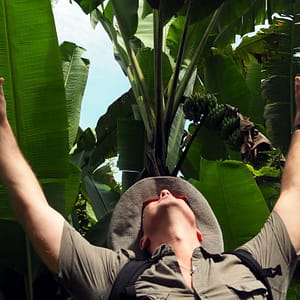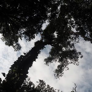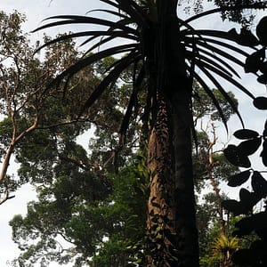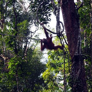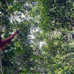 Kdesi v diaľke sa ozval krik strážcu, ako volá orangutany ku jedlu. Ideme pár sto metrov chodníčkom ku stupňovitým laviciam, kde sa všetci usadíme. Pred nami je preriedená džungľa s malým pódiom s banánmi, papájou a kokosom. Krížom krážom sú natiahnuté tri laná. Po chvíli sa začnú ľudia obzerať a v korunách stromov registrujeme pohyb a sem tam oranžové chlpy.