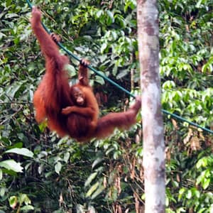 Postupne zreteľne vidno samicu s jedným mláďaťom. Na okraji čistiny sa samica zavesí na lano, malé na ňu a mieria rovno ku jedlu. Občas zastanú, malá zlezie, zavesí sa na lano, potom naskočí na mamu a pokračujú. Mama zbehne dole po banány, papáju a kokos, celý trs banánov si strčí do úst aby mala ruky a nohy voľné. Na vysokom odpílenom strome v kľude zjedia banány a papáju. Ak nerátame malého špekulanta, čo jej podchvíľou chce šlohnúť kokos. Kokos nakoniec mama rozbije o kmeň na ktorom sedí a mláďa dopije vodu, čo nevytiekla. Mama potom odlamuje kusy orecha a maškrtia spolu. Ešte zbehnú po jeden trsík banánov, tentoraz si ich do úst napchá mláďa. Do toho celého behajú po lanách a stromoch veveričky. Obaja orangutani sa nakoniec poberú preč tak, ako prišli.