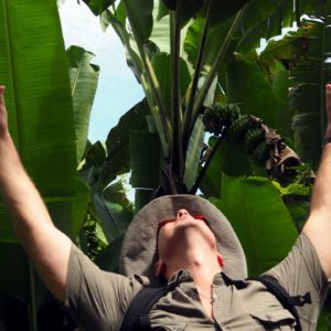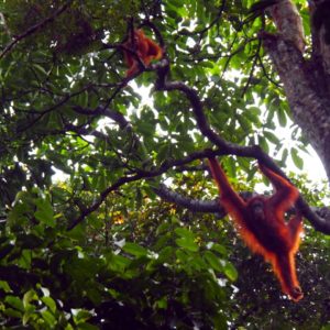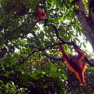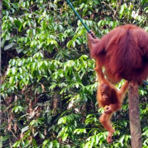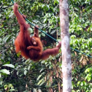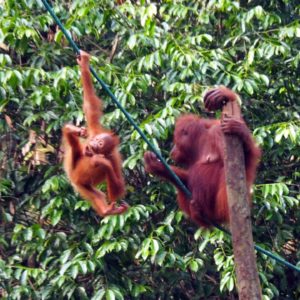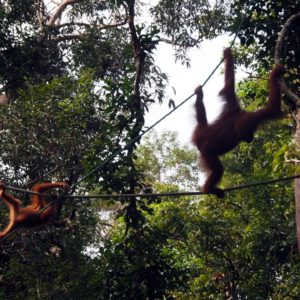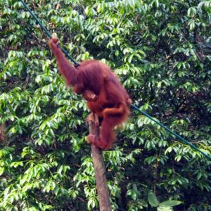 Kdesi v diaľke sa ozval krik strážcu, ako volá orangutany ku jedlu. Ideme pár sto metrov chodníčkom ku stupňovitým laviciam, kde sa všetci usadíme. Pred nami je preriedená džungľa s malým pódiom s banánmi, papájou a kokosom. Krížom krážom sú natiahnuté tri laná. Po chvíli sa začnú ľudia obzerať a v korunách stromov registrujeme pohyb a sem tam oranžové chlpy.