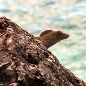 Na raňajky máme slušný krém brulé a veľa banánov. Tie sú tu naozaj populárne. Videli sme chlápka ako si jeden doniesol so sebou a keď mu doniesli menúčko vylúpol si ho a položil na tanier. Raňajkujeme za stolíkom postavenom z kusu omietky na ohrdzavenej, roxorovitej konštrukcii – nožičkách. Obzeráme jašterice, ktoré vyzerajú skoro ako žaby. Skáču namiesto chodenia, telo majú žabovité, len majú jašteričie chvosty. Samec sa rozbehne za samičkou a vyťahuje na ňu červený podbradok.