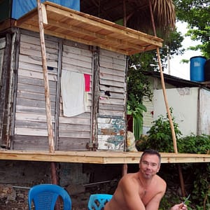 Keď Gerard neprekladá vymýšľa čosi z drevom. Počas jednej našej HH urobí terasu pred svojím domčekom na brale s výhľadom na pláž. Nie je síce úplne hotová – treba opíliť prečnievajúce dosky, ale to zvládne iný večer.