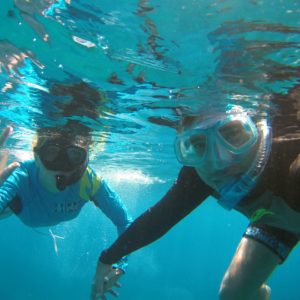 Dostávame sa do príjemnej rutiny. Ranná jóga, najprv mastné vajcové empanády, potom volské oči a čierna káva v záhradke na brale. Potom príde na rad šnorchľovanie. Vo vode to nie je veľká sláva. Ani moc rýb a ani koralu. Navyše keď to začne byť zaujímavejšie, je to už poriadne hlboko. Každý deň ale prináša niečo iné, raz korytnačka v hĺbke, sépie a krabík pri brehu, veľké rohaté ryby a rezidentná baracuda kúsok od brehu.