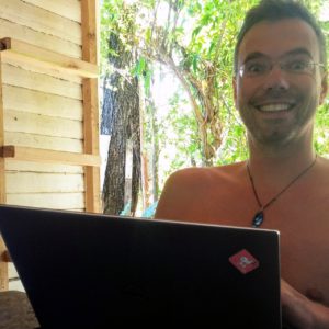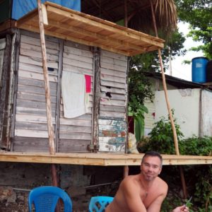Keď Gerard neprekladá vymýšľa čosi z drevom. Počas jednej našej HH urobí terasu pred svojím domčekom na brale s výhľadom na pláž. Nie je síce úplne hotová – treba opíliť prečnievajúce dosky, ale to zvládne iný večer.
