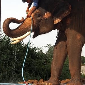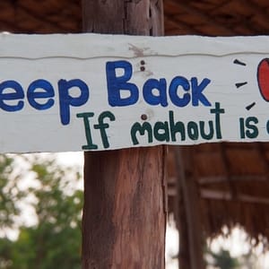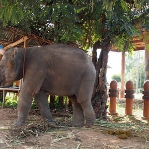 Po dobrých 2 hodkách nás vykladajú pred sloním centrom, kde obdivujeme výrobky zo slonoviny a slonej kosti. Slonovina je skutočne nádherná, výrobky majú delikátnu štruktúru pripomínajúcu prekrížené kruhy na vode a miestami až perleťový lesk. Kupujeme si vstupenky (100B) a poď ho híkať nad slonmi. Dedinka vyzerá trošku ako cirkus, len miesto maringotiek sú prístrešky a majú – čuduj sa svete v slonej dedine – iba slony. Pristavíme sa pri dvoch malých, opatrne sa s nimi fotíme a chlapík nám ponúka zväzok trstinových šúlkov za 30B, že aby sme ich nakŕmili. 3 ročný sloník má celkom silu v chobote, keď mi ním omotá ruku, ledva mu ju stihnem vytrhnúť, kým si ju strčí do tlamy. S veľkými to potom už radšej ani neskúšam. Na WC majú v pisoároch namiesto smradľavých kociek pólky nejakého ovocia, čo pripomína pólku rozčúraného citróna.