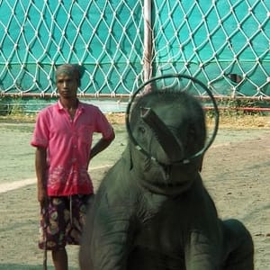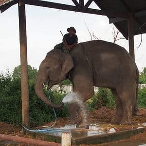 Prezrieme si múzeum a už hrá hudba – asi na show o druhej. Sú dve (prvá o 10.00, druhá terazo 14.00) a okrem nás, obyvateľov dedinky a 3 ďaľších domáco vyzerajúcich nikde nikoho. Kupujeme si drinky a čakáme čo sa bude diať. Miest na sedenie je veľa a tak špekulujeme z kade bude najlepší výhľad. V ďiaľke sa zrazu objavia tri pikapy s bielymi turistami, tak sa radšej rýchlo presúvame v nádeji, že show čoskoro začne. A aj začala. Rôzne staré (a veľké) slony predvádzajú rôzne kúsky a medzitým ich môžu návštevníci/diváci odmeňovať a kŕmiť zväzkami trstiny za 20B. S bielymi turistami je tam sprievodca, ktorého slony už asi dobre poznajú lebo stále za nim natŕčajú choboty až kúpi 5 zväzkov a ani nedáva dole gumičky, ktoré zväzok držia pokope. Po všetkom tom klaňaní, tancovaní, futbale a basketbale to slony zbalia a idú do slonoumývarky. Zostanú len dva na fotenie sa na chobote (20B). Obehneme si zvyšok dediny zastaviac pri umývarke zasneme nad automatikou s akou si slony zoberú hadicu, nalogajú sa, podajú ju mahutovi, ten ich opláchne zvrchu a niektoré z toho majú aj mamutiu erekciu. Všetko v dedine sa točí okolo slonov. Na každého slona dostávajú mesačne 8000B dotáciu. Čiastočne ide o tradíciu a čiastočne chcú z Thajska (a hlavne z Bangkoku kde spôsobujú zápchy) stiahnuť potulných mahutov s ich slonmi, ktorí hľadajú živobytie.