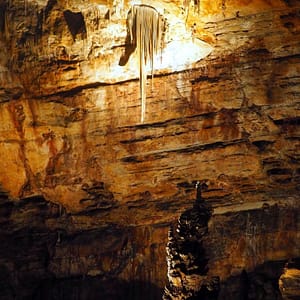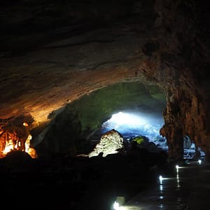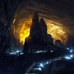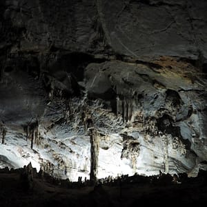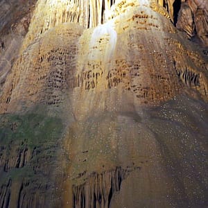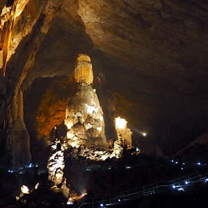 Vo vnútri je to naozaj veliké. Všetky sály sú nesmierne priestranné s neuveriteľnými formáciami. Celkovo sú sprístupnené 2 kilometre. Sprievodca zapína a vypína svetlá ako ideme. Má lejzrové ukazovátko a veľký lampáš, ktorý si na miestach výkladu zapicháva do pripravenej predlžovačky. Na kilometri 1.2 je dokonca WC. To sme v jaskyni tiež ešte nevideli. Pozeráme na to všetko ako puci, je to tu naozaj krásne, neklaustrofobické a celkom vkusne nasvietené. Nie ako kasíno vo Vietname. Ani rozsahom sme niečo tak gigantické ešte nevideli. A ku koncu, keď začnú pribúdať stúpania a schody máme celkom aj dosť. Je to, povedal by som až príliš veľké. Pri poslednej formácii si dedko vypýta sprepitné a vyšikuje nás obchádzkou po vlastnej osi naspäť. Bez svetla. Občas stretneme skupinu v protismere, tak tí nám prisvietia, inak uháňame 2km naspäť tmou. Aj sa dlhším šlapaním celkom zahrejme, inak je tu príma klíma.