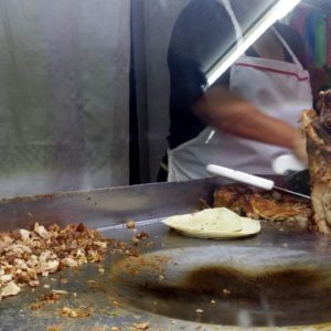 Na večeru nájdeme bravčové tacos. Na grile majú opečenú bravčovú hlavu a kusy pečeného mäsa. To nasekajú nadrobno, podľa objednávky zmiešajú s nasekanými kožami a ušami a fuknú do placiek. Posype sa to cibuľkou a cilantrom. Nechceli sme veľa mäsa, tak sa skúšame doraziť ešte kúskami pizze a vegetariánskou quesadillou plnenou tekvicou. Cestu na busík už ovládame a odvoz chytíme oveľa rýchlejšie.