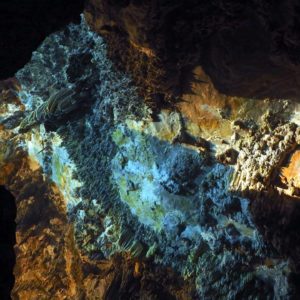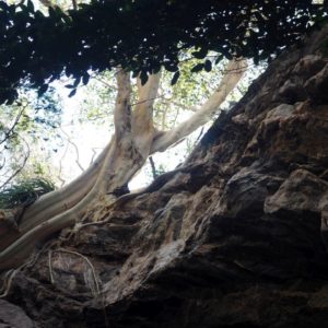 Z domu sa po čajíku a koláčikoch, ktoré sme si včera prefíkane nakúpili vyberieme ku stanici č. 1. Berie nás minibus – vyhliadková jazda. Zbierame pasažierov opačným smerom – strmými uličkami a prašnými cestami. Auto ku jaskyni ide až o 45 minút, tak si nakúpime proviant. Džúsik s kaktusmi, banány a pivo Corona v lekárni za lepšiu cenu ako v bežných obchodoch (Oxxo). U babky pred stanicou si objednáme dve quesadilly s cecinou – tenký hovädzí rezník na grile. A už je tu náš spoj. Trošku sa vyplašíme ale ideme mu povedať, že čakáme ešte na babku a jej jedlo. Minibus nás naloží, k tomu ešte jednu tehošku a ani nečaká, že by sa zaplnil. Fujazdíme zatáčkami s otvorenými dverami a okienkami. Vonku pečie slnko, no vo vnútri je príjemne. Po skoro hodine sme za 80Pesos vyhodení pred jaskyňou. Kupujeme lístky (2×80) a akurát vpúšťajú dnu na 13:00.