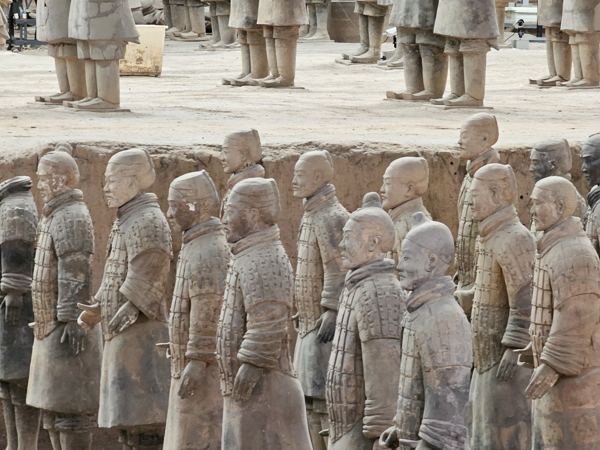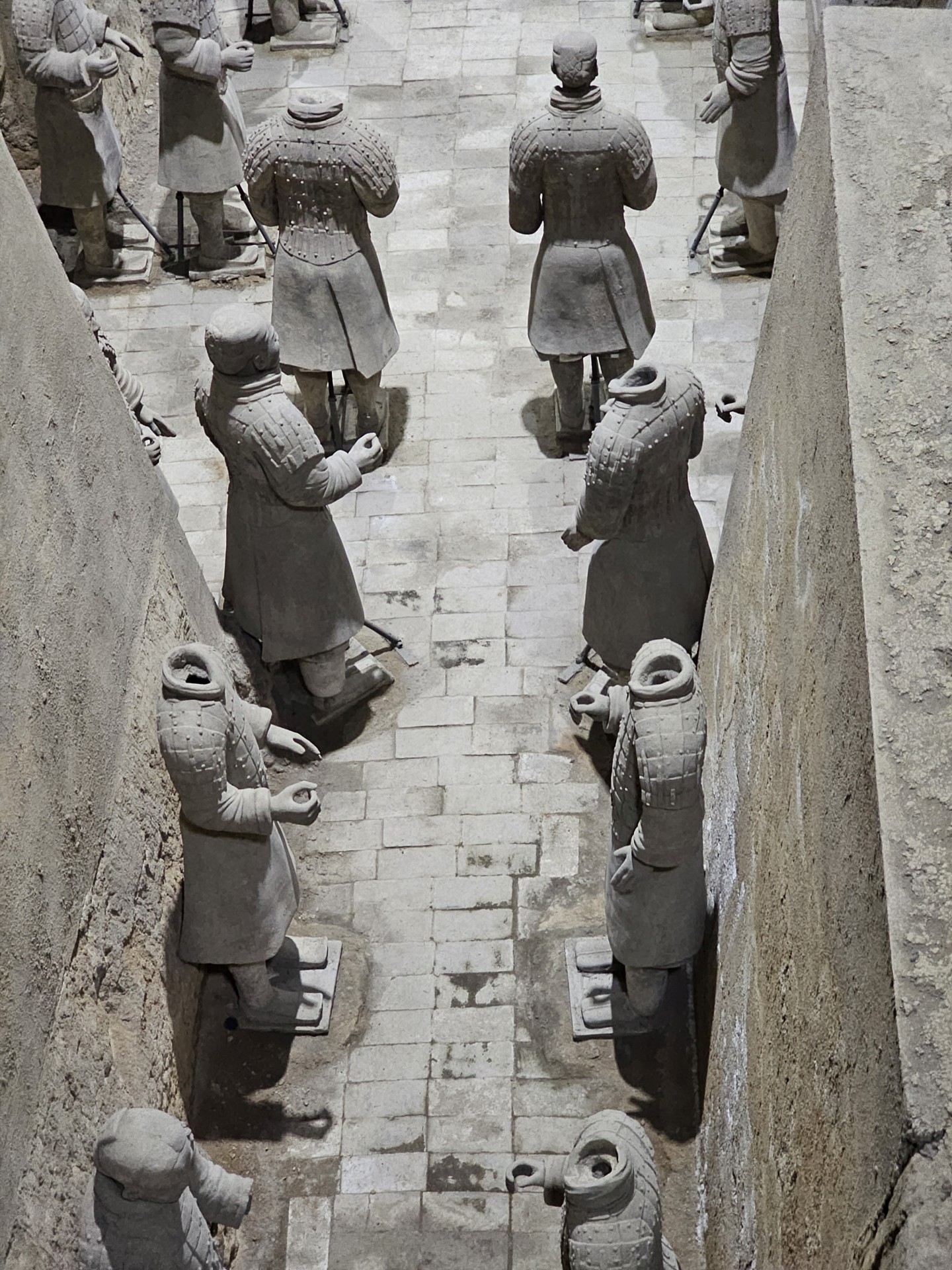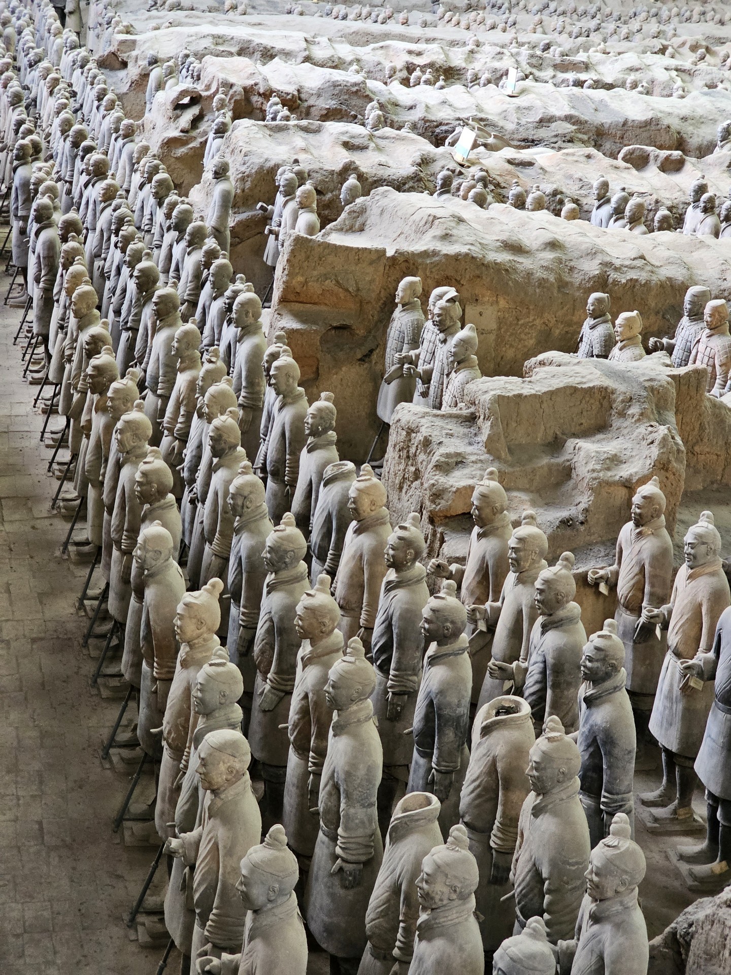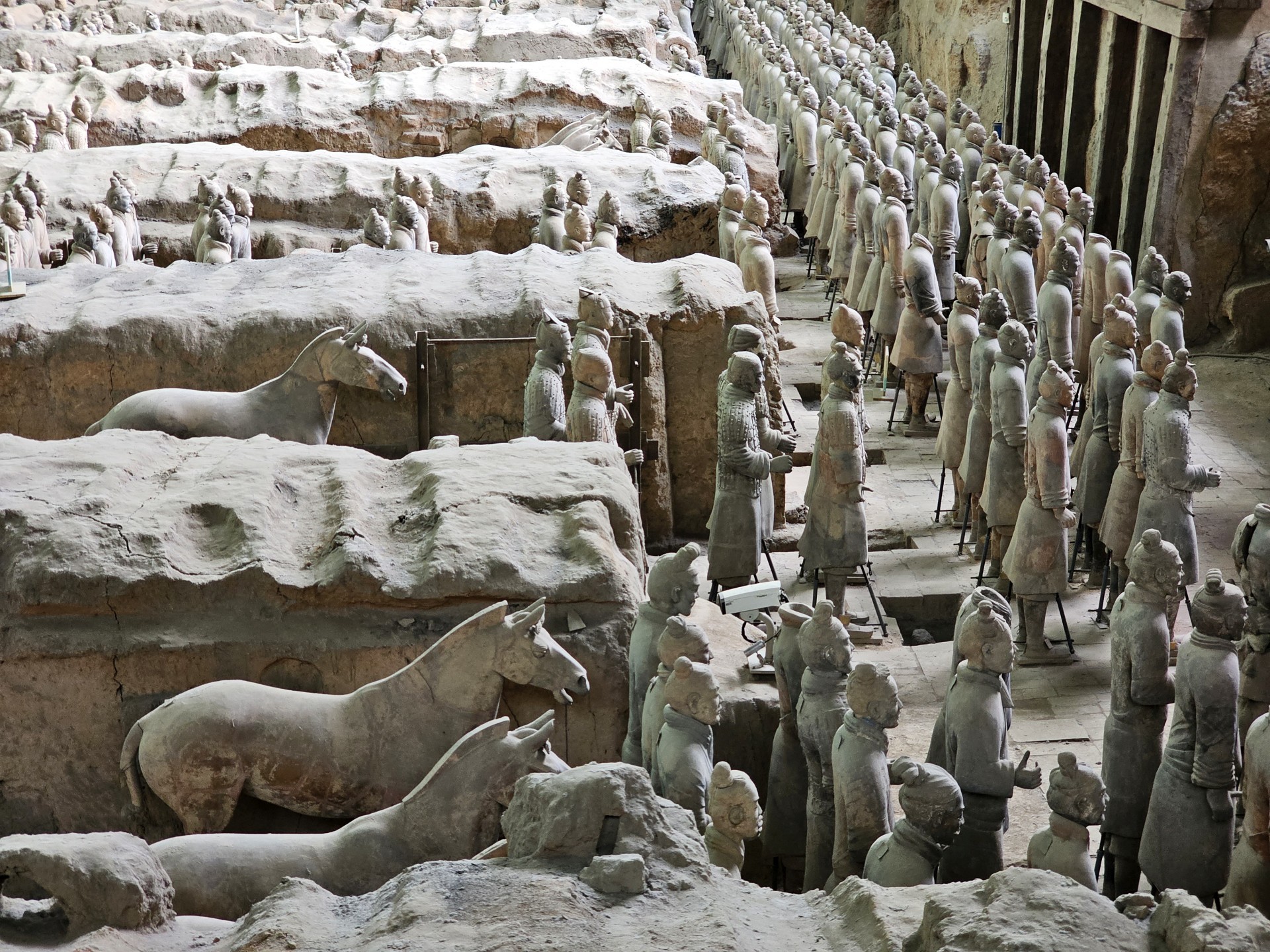 Všetko nasvedčuje tomu, že vykopali veľkú jamu, tam naskladali do radov armádu vojakov z hliny v životnej veľkosti a potom tie rady oddelené múrmi pozakrývali a zasypali. V oblasti je aj hrobka panovníka Qin Shi Huang (prvý cisár a zjednotiteľ Číny), o ktorej je mnoho dokumentov, ako napríklad, že je naplnená ortuťou, no o armáde nie je nikde žiadna zmienka. Asi to malo byť tajné. Armádu náhodou vykopal roľník v 1974 pri kopaní studne. Hrobka panovníka doteraz nie je otvorená, čakajú, kým sa ortuť nadobro vyparí.