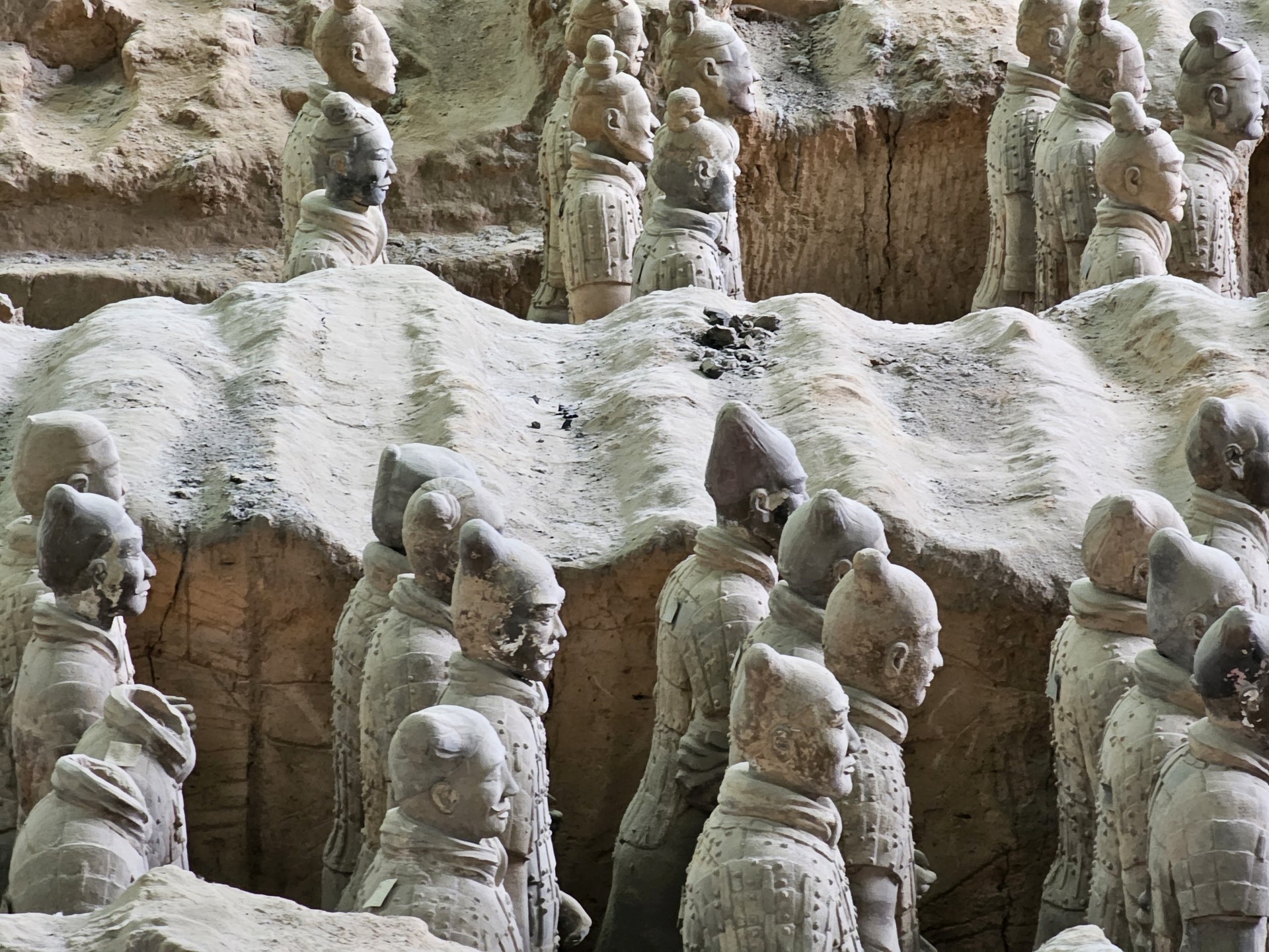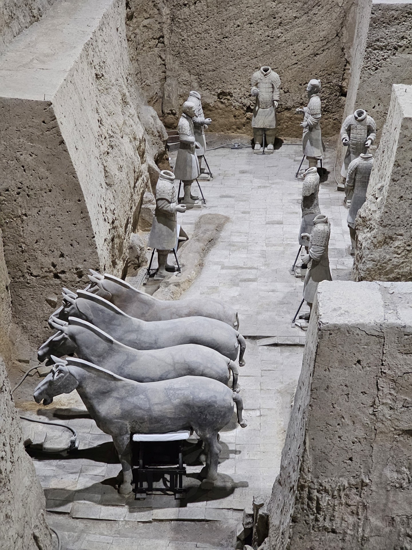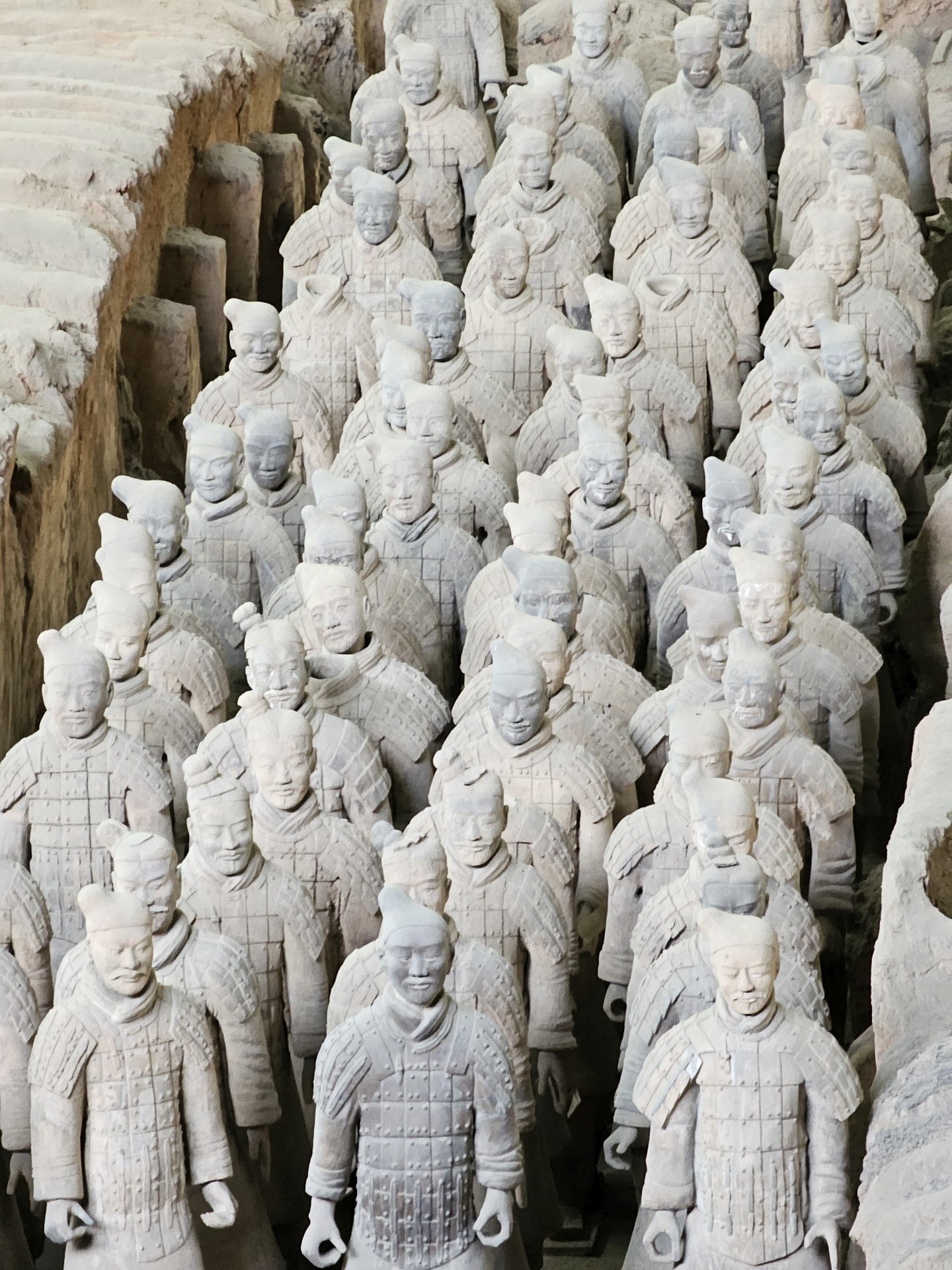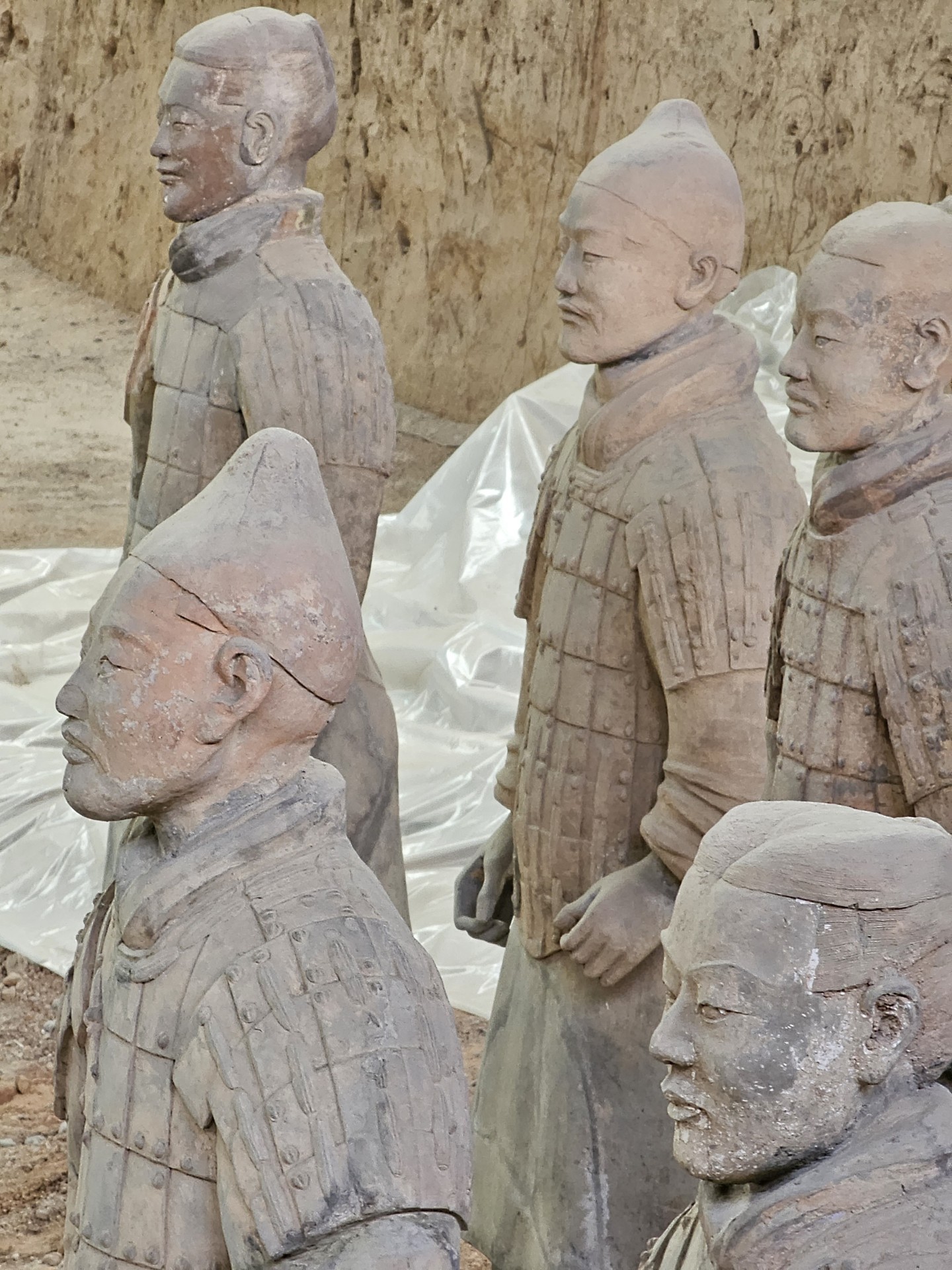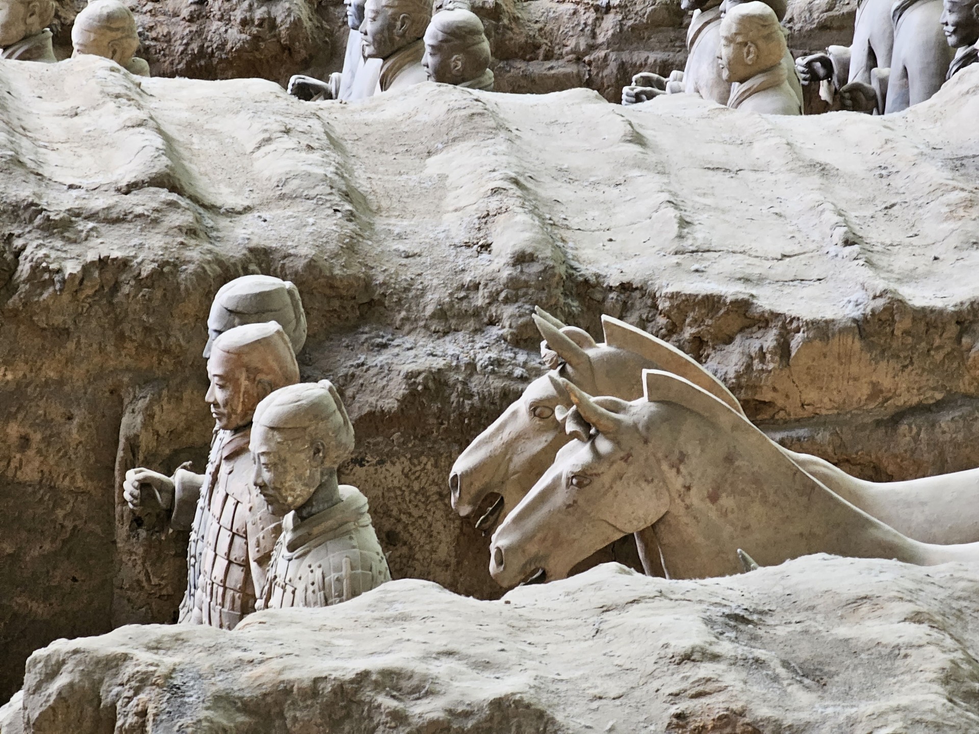 Všetko nasvedčuje tomu, že vykopali veľkú jamu, tam naskladali do radov armádu vojakov z hliny v životnej veľkosti a potom tie rady oddelené múrmi pozakrývali a zasypali. V oblasti je aj hrobka panovníka Qin Shi Huang (prvý cisár a zjednotiteľ Číny), o ktorej je mnoho dokumentov, ako napríklad, že je naplnená ortuťou, no o armáde nie je nikde žiadna zmienka. Asi to malo byť tajné. Armádu náhodou vykopal roľník v 1974 pri kopaní studne. Hrobka panovníka doteraz nie je otvorená, čakajú, kým sa ortuť nadobro vyparí.