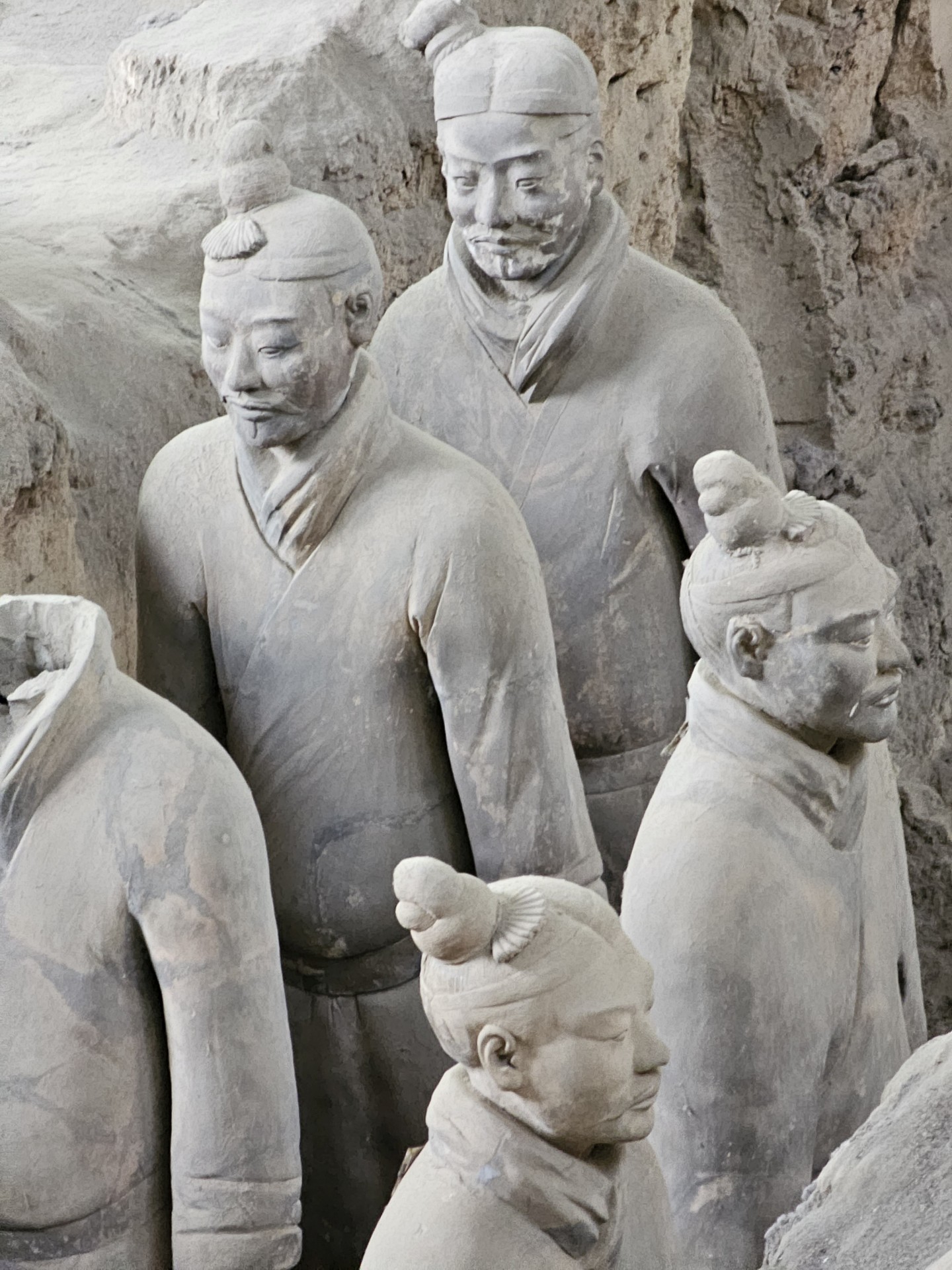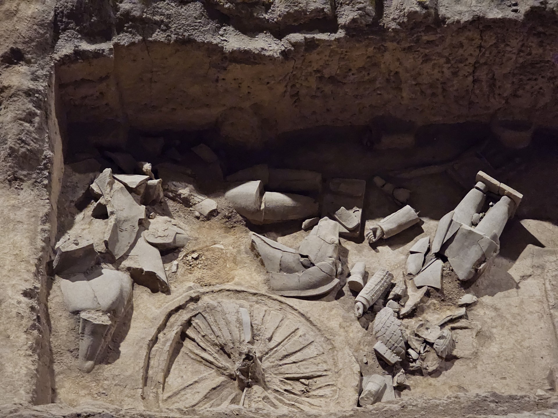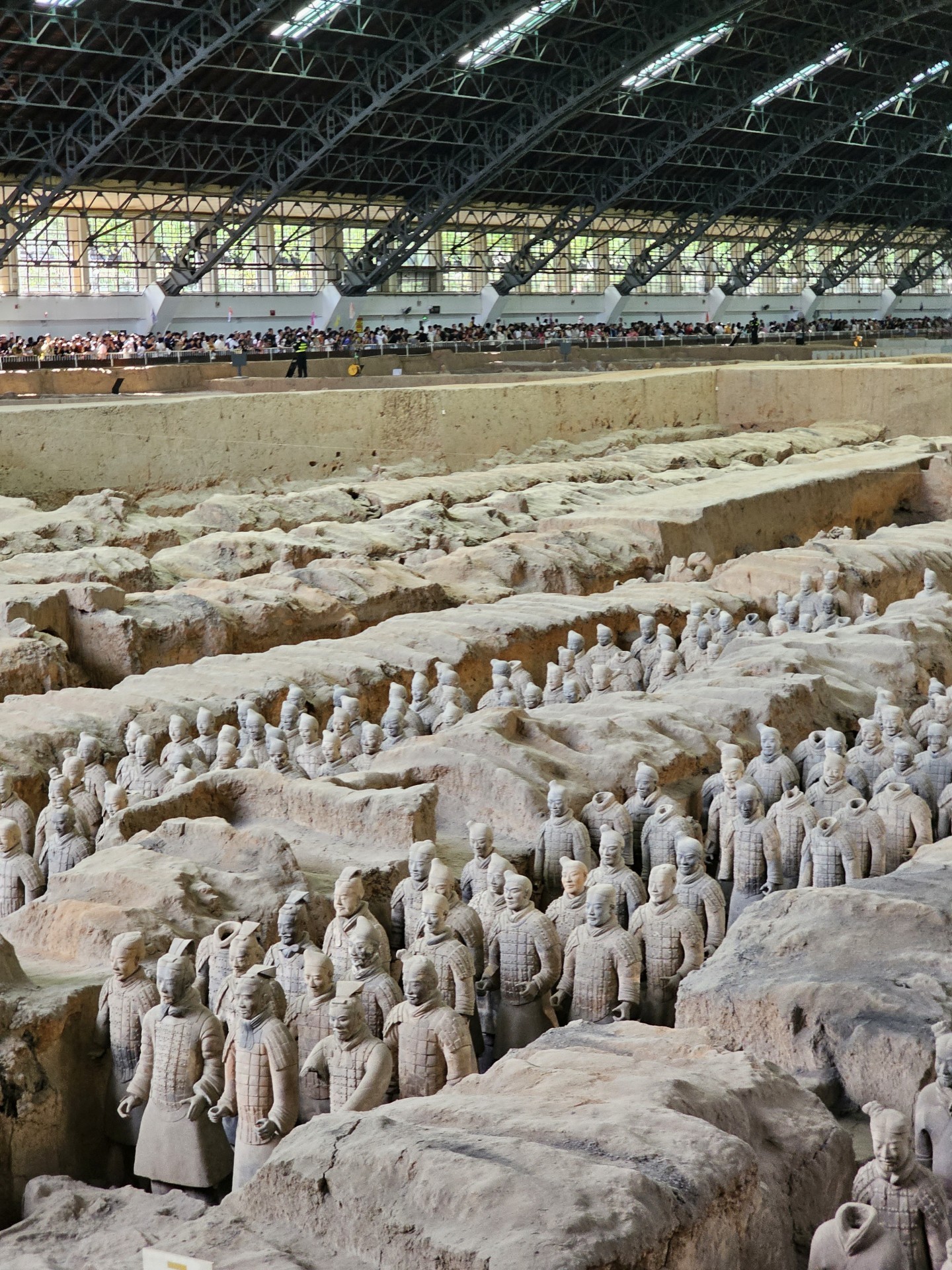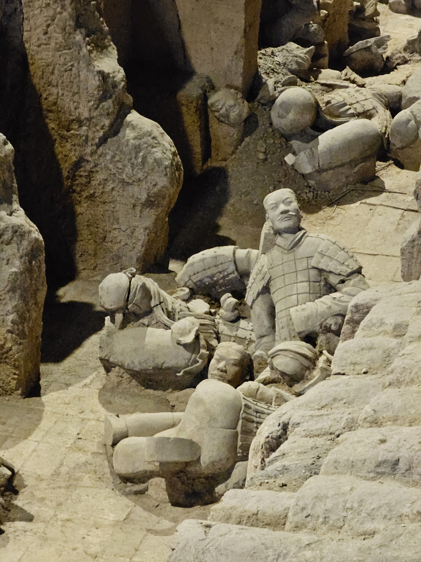 Všetko nasvedčuje tomu, že vykopali veľkú jamu, tam naskladali do radov armádu vojakov z hliny v životnej veľkosti a potom tie rady oddelené múrmi pozakrývali a zasypali. V oblasti je aj hrobka panovníka Qin Shi Huang (prvý cisár a zjednotiteľ Číny), o ktorej je mnoho dokumentov, ako napríklad, že je naplnená ortuťou, no o armáde nie je nikde žiadna zmienka. Asi to malo byť tajné. Armádu náhodou vykopal roľník v 1974 pri kopaní studne. Hrobka panovníka doteraz nie je otvorená, čakajú, kým sa ortuť nadobro vyparí.