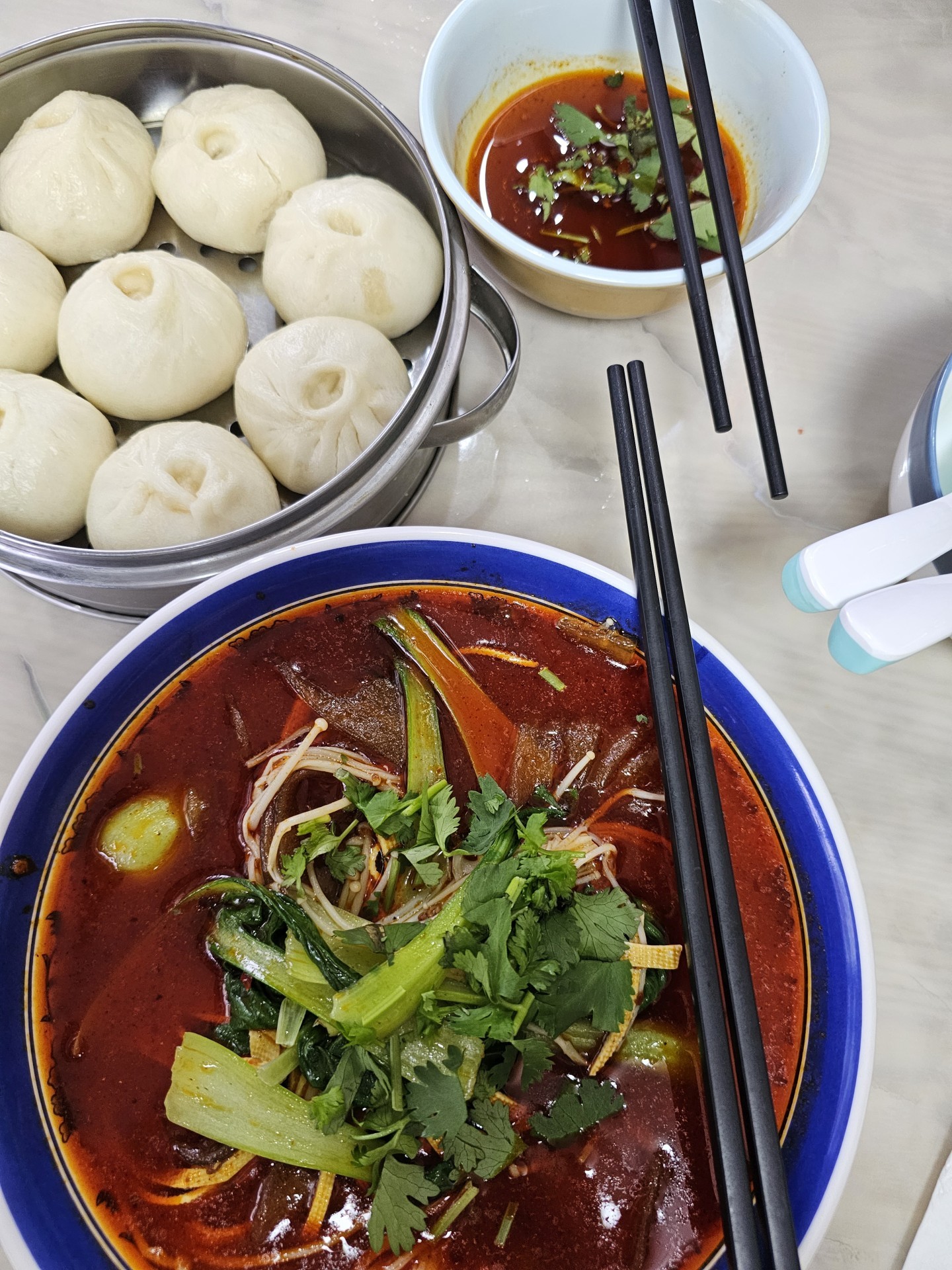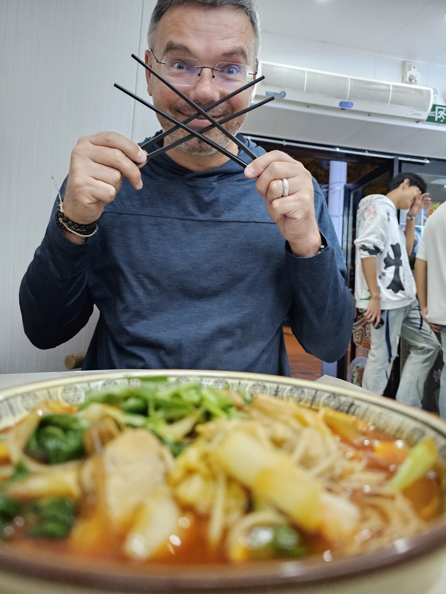 Dáme si pre istotu skorý obed. Objednáme si to, čo včera večer nemali. Je to po prvýkrat poriadne štipľavé. Chválabohu, že nám to včera nedoniesli. Je to podobné, ako sme mali včera, len menšie, bez mäsa a brutálne štipľavé. Aj rezance sú iné, široké, hrubé a priesvitné. Asi to je lokálna špecialita.